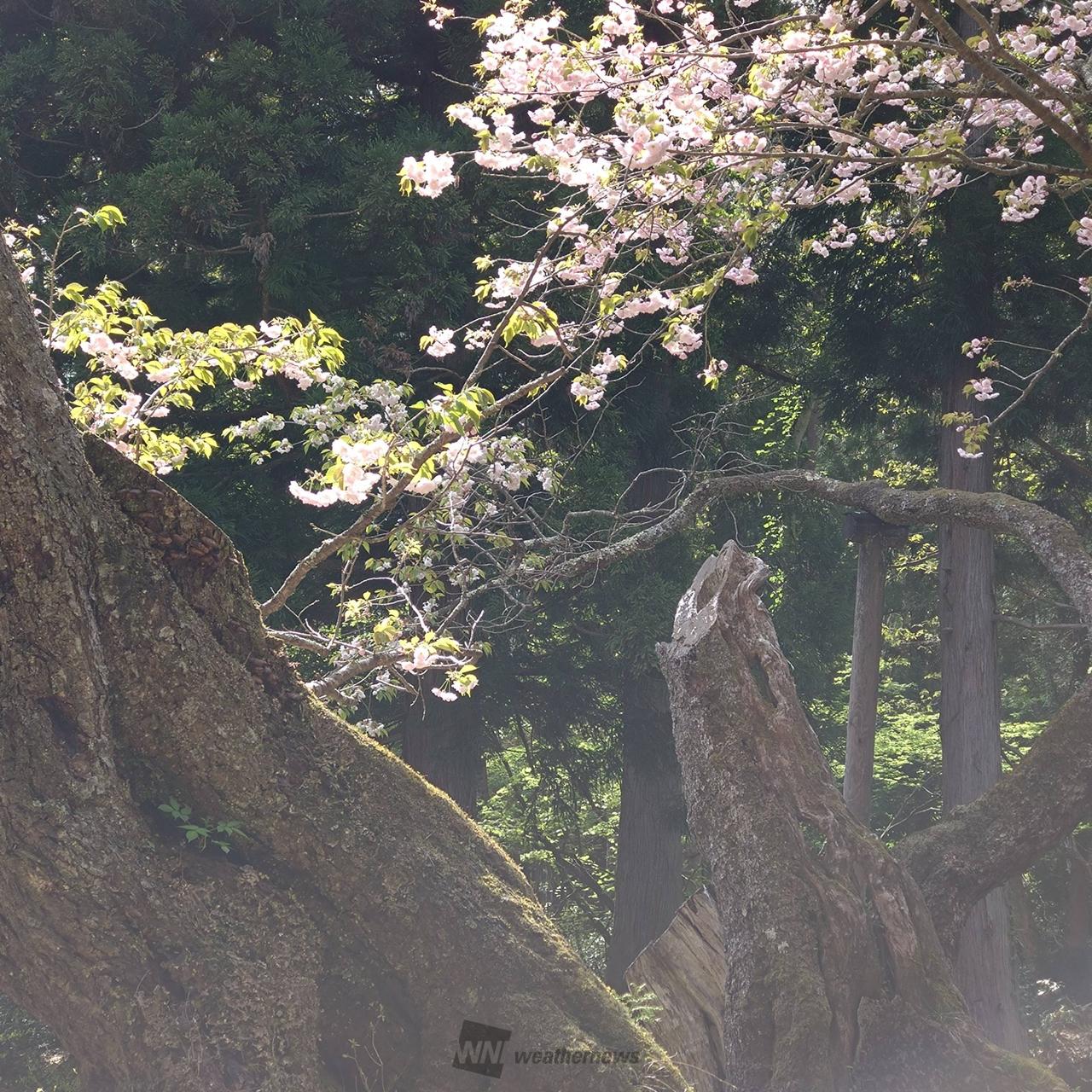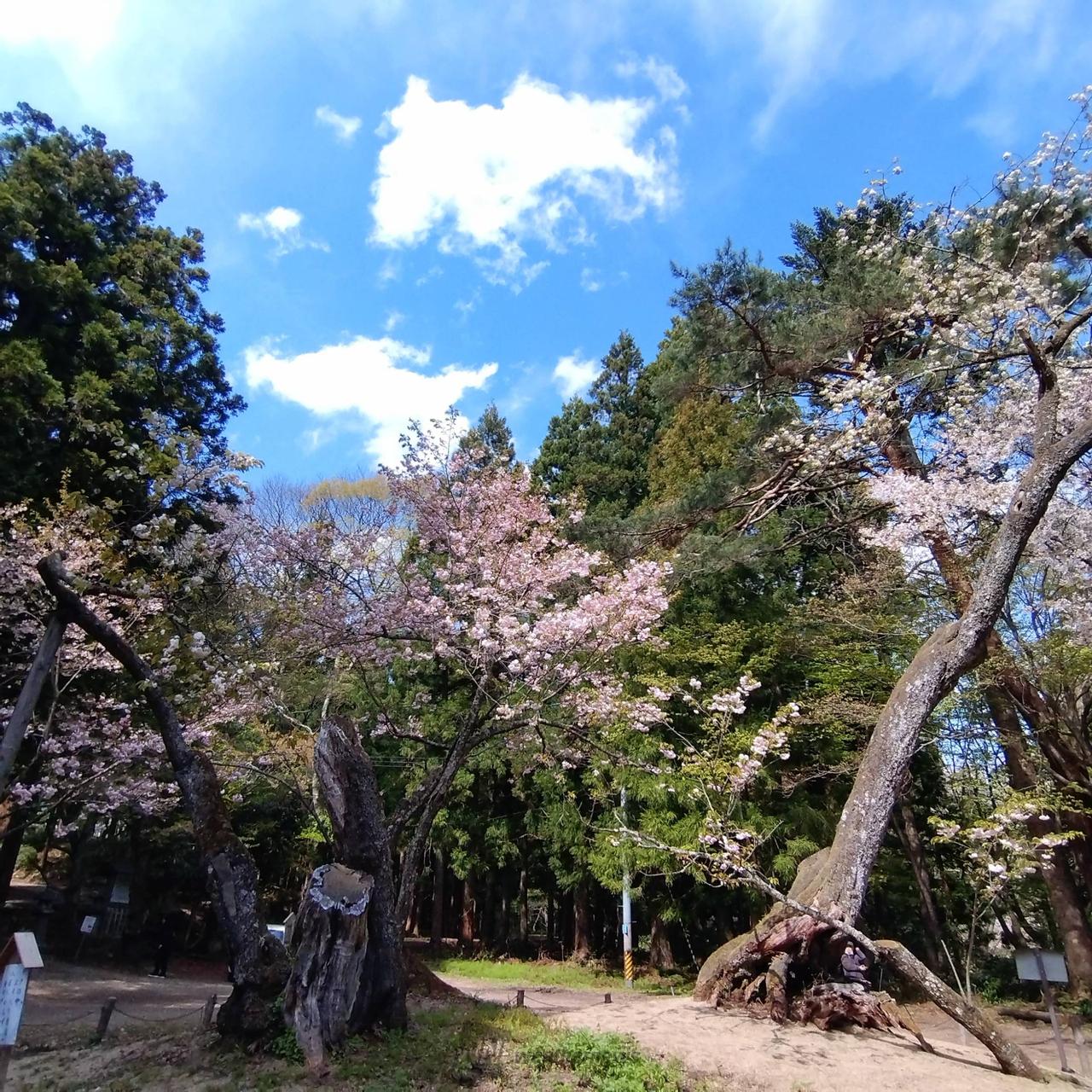 磐椅神社境内にあり、樹齢1000年と言われ、会津五桜の1つに数えられています。遅咲きのサトザクラで、花色が鹿の毛彩に似ていることが名前の由来です。