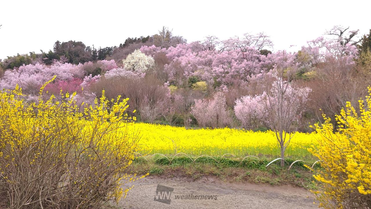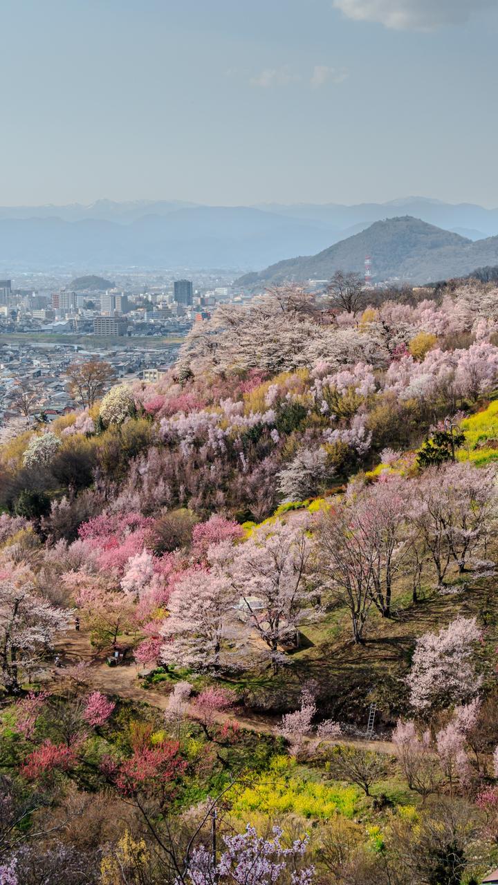 花木栽培農家が善意で開放している公園で、福島に桃源郷ありと言われる花の名所。ウメ、トウカイザクラ、ヒガンザクラ、レンギョウ、ボケ、ソメイヨシノ、ハナモモなど約70種類もの花々が、まさに百花繚乱のごとく次々と咲き競う様は圧巻そのもの。頂上での吾妻連峰と花々のコントラストは必見です。
