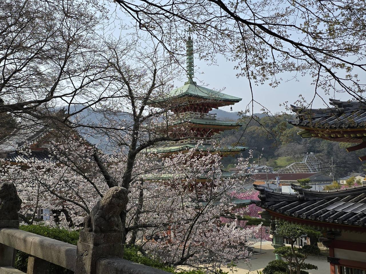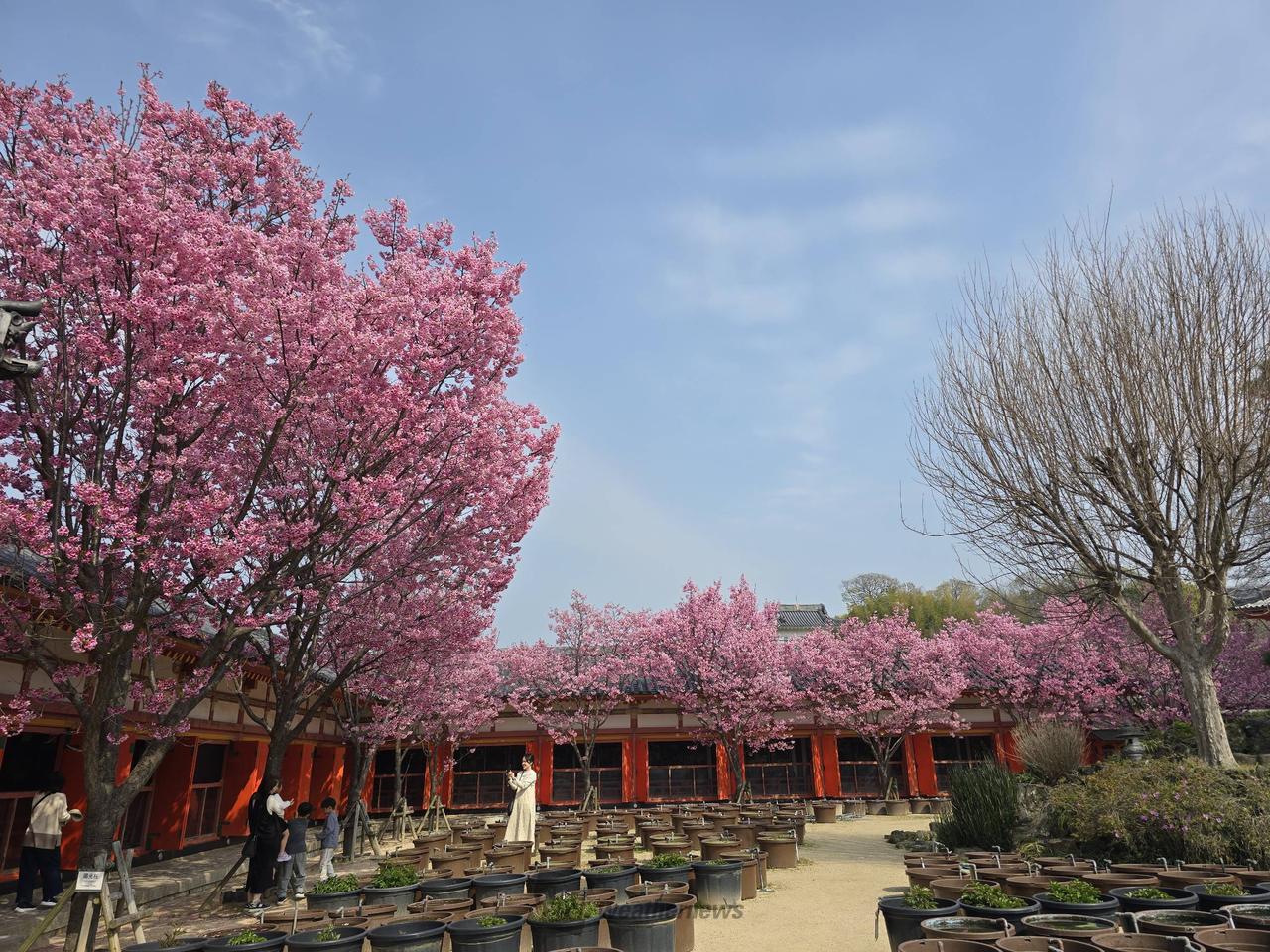 もと実業家の耕三寺耕三が母の菩提寺として建立した浄土真宗本願寺派の寺です。境内に立ち並ぶ絢爛豪華な伽藍と薄桃色のサクラの花びらが調和し、荘厳な美しさを醸し出しています。
