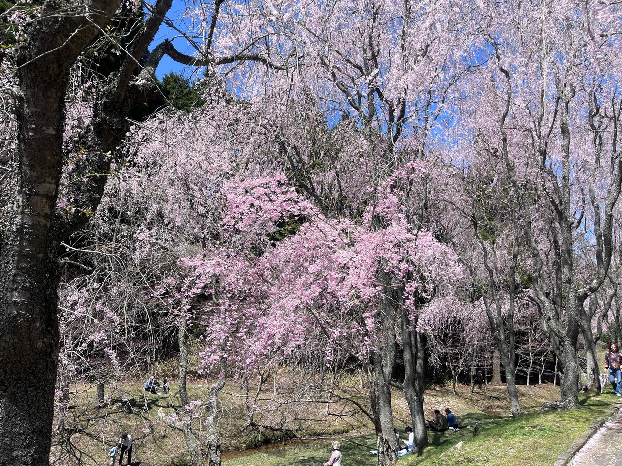 園内はシダレザクラ約250、ソメイヨシノ、ヤエザクラ合わせて750本あります。道の両側からせまるシダレ桜は圧観です。