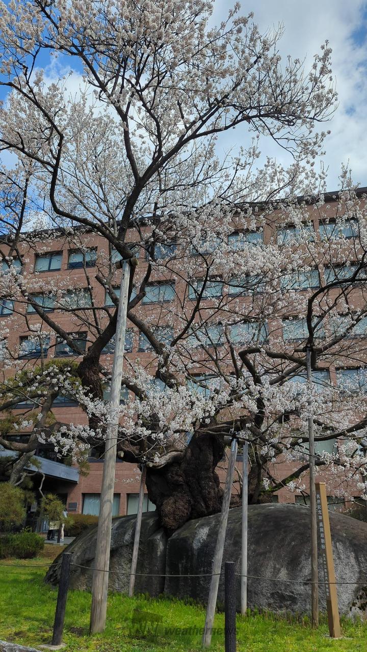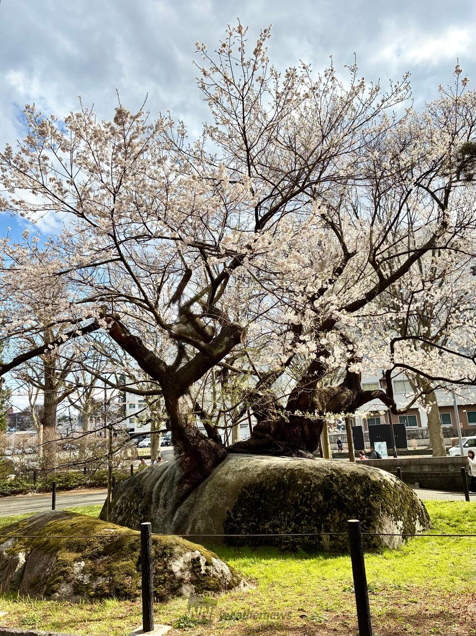 樹齢約360年から400年のエドヒガンが周囲約21mの岩を割って生えており、国の天然記念物に指定されています。盛岡市内の他の桜よりも早くその淡いピンクの花を咲かせ、幹周囲4.3m、高さ10.8mもの大木であり、その姿は圧巻です。