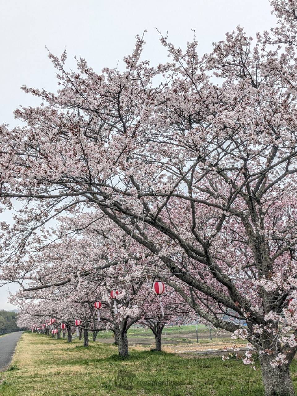 久慈川堤防の桜づつみに約130本のサクラが1.3kmほど続き、満開の季節には桜堤が淡いピンクのベルトのように見えます。
