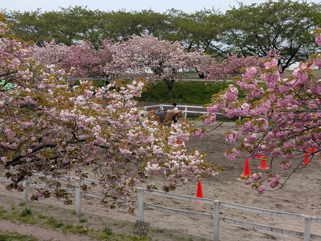 ネーブルパークはソメイヨシノが約130本、八重桜が約280本植えられている茨城県でも有数の桜の名所です。4月初旬でソメイヨシノが終わると、八重桜が咲き始めます。八重桜はポニー牧場の周囲とつり堀の周囲と間の川沿いに植えられています。