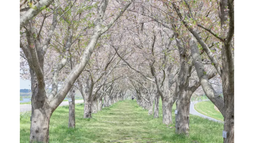 〈美しく整列された2列の桜並木の間に立っての撮影〉や、〈桜並木全体を見渡すような撮影〉がおすすめです!