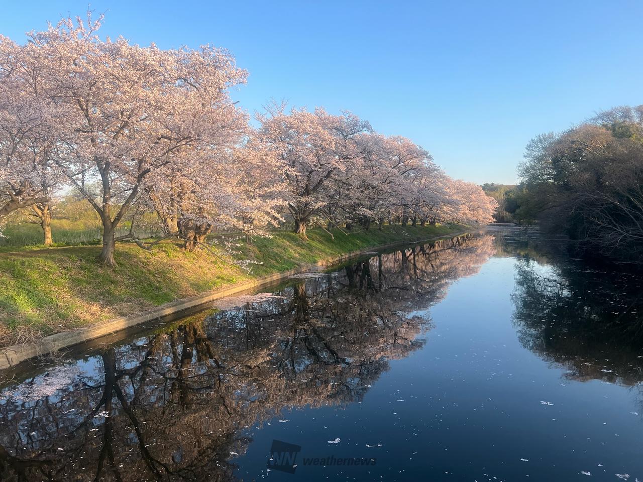 1925(寛永2)年に小貝川をせき止めて造られた福岡堰は、岡堰、豊田堰とともに関東三大堰の1つに数えられています。1.8kmにも及ぶ遊歩道沿いに咲く大小あわせて約450本のソメイヨシノが水面に映り目を楽しませてくれます。