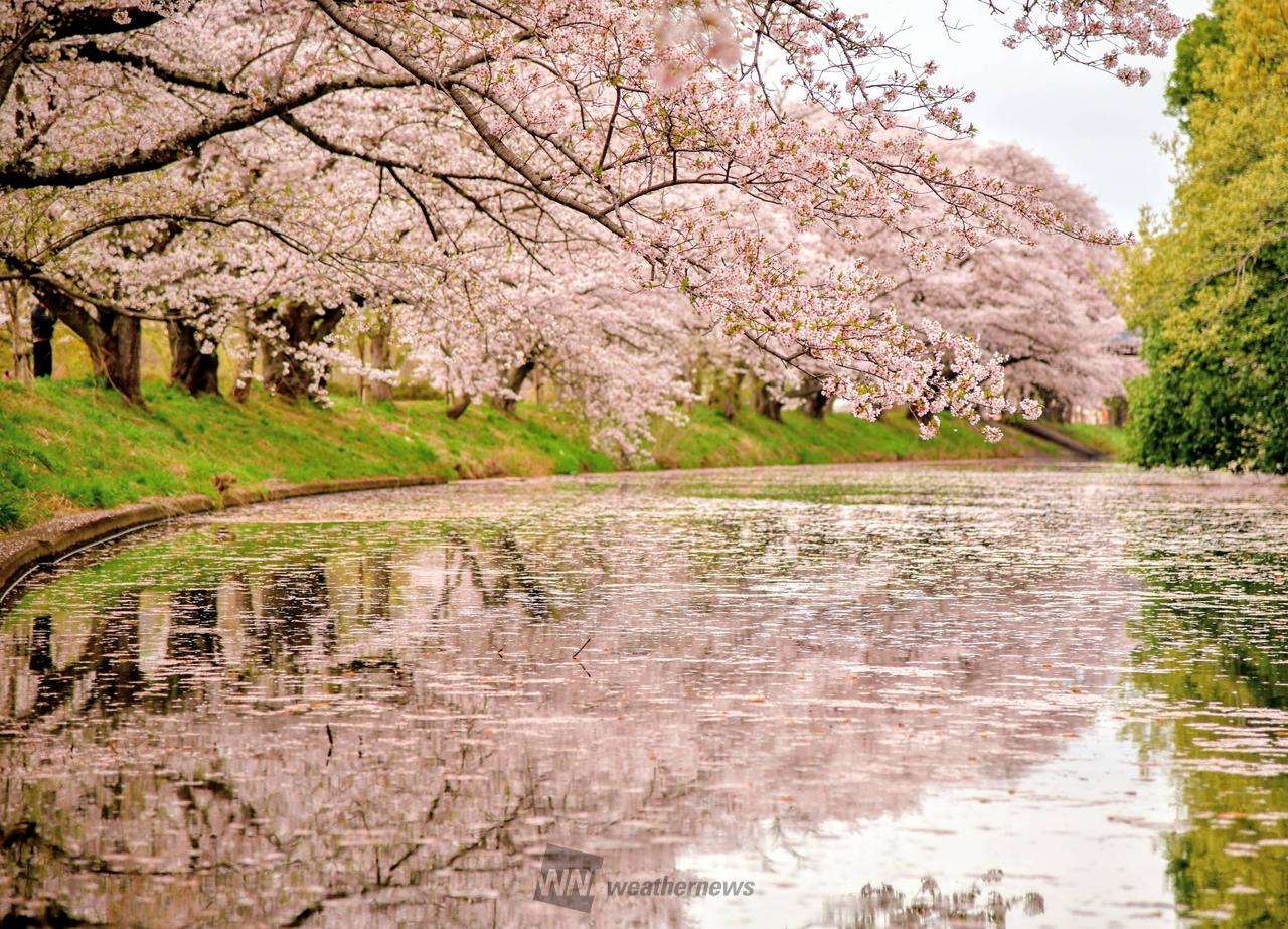 1925(寛永2)年に小貝川をせき止めて造られた福岡堰は、岡堰、豊田堰とともに関東三大堰の1つに数えられています。1.8kmにも及ぶ遊歩道沿いに咲く大小あわせて約450本のソメイヨシノが水面に映り目を楽しませてくれます。