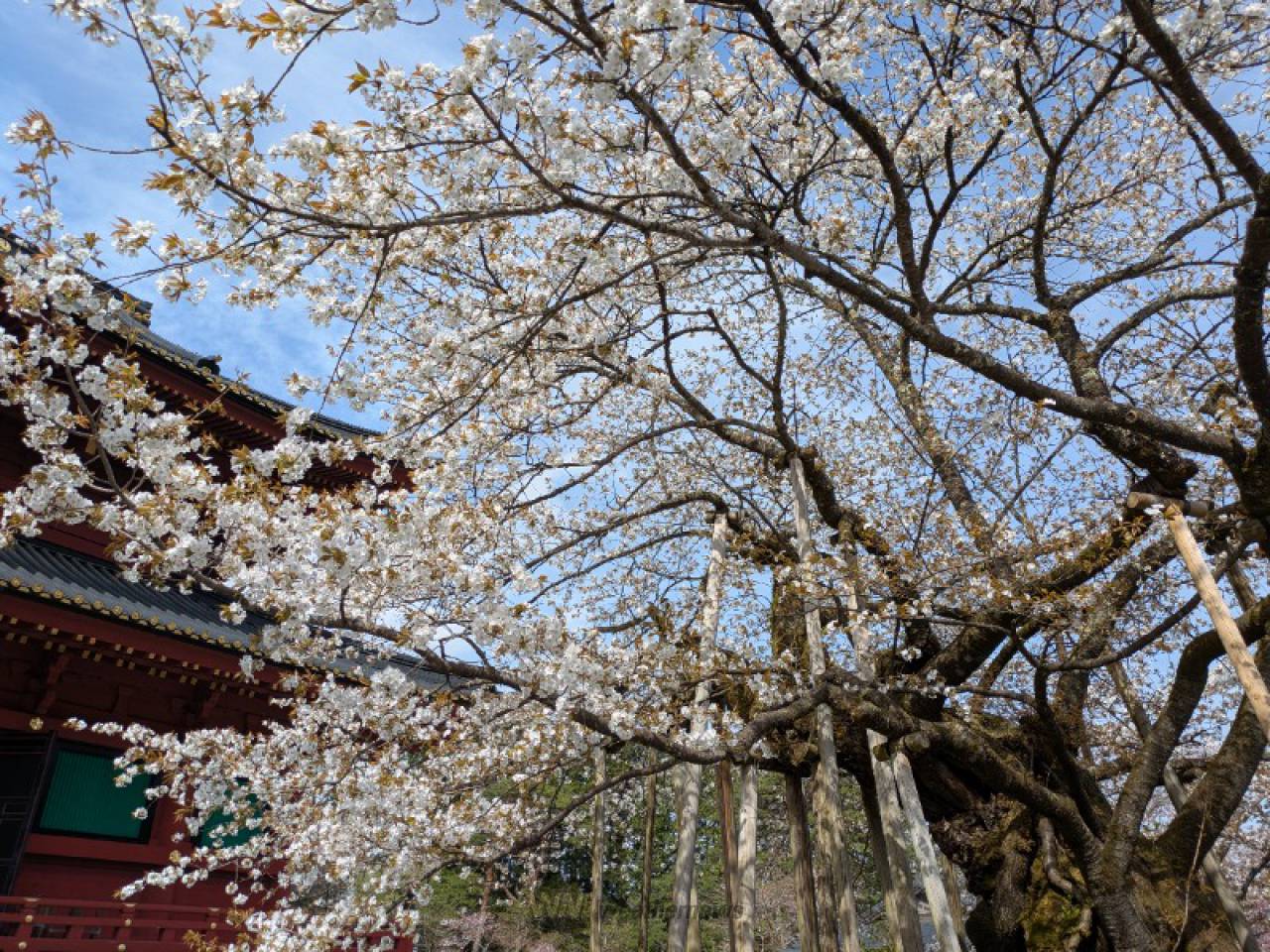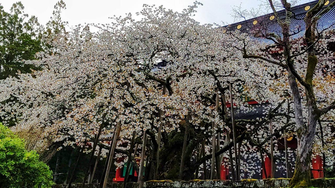 樹齢約500年の天然記念物。日光山輪王寺の「金剛桜」はヤマザクラの突然変異種で、白花大輪、豊かな花香の極めて珍しい桜です。開花時期は4月下旬〜5月上旬です。