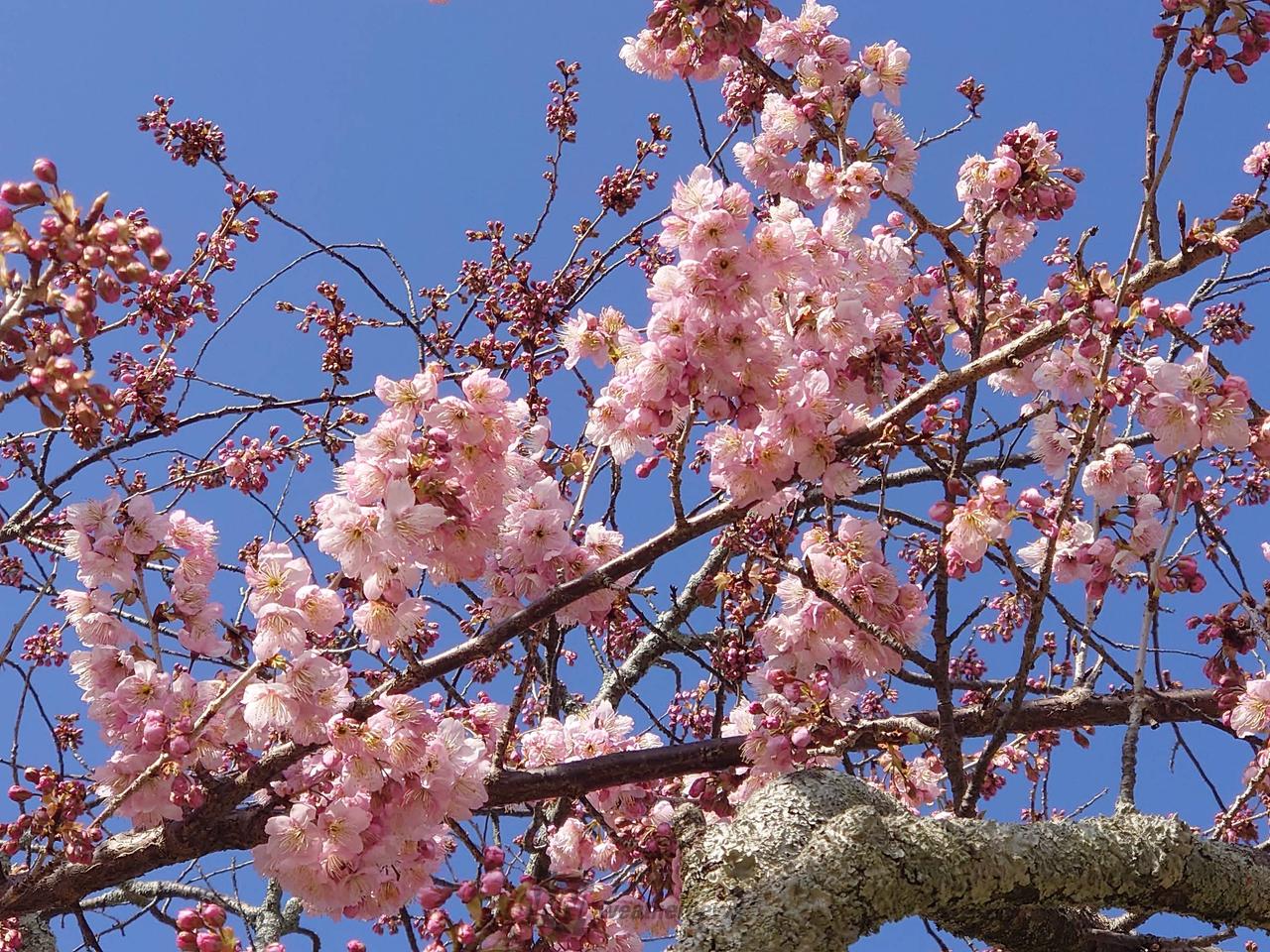 ツバキカンザクラ(約20本)が3月上旬から咲き始め、桜の期間を長く楽しめます。桜見物のほか、復元された湯築城跡の散策もオススメです。