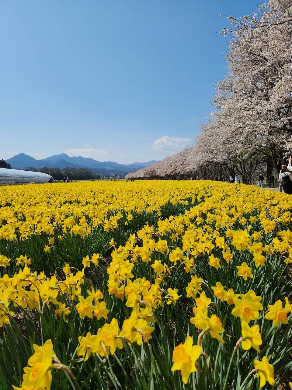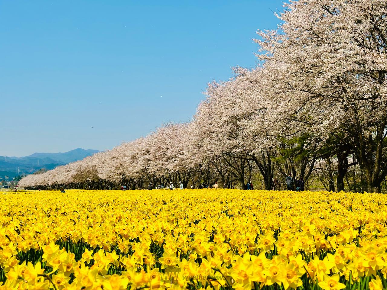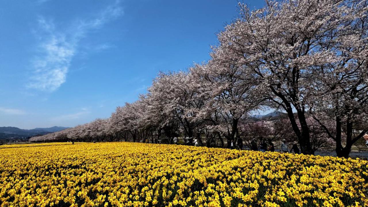 約30万本のラッパ水仙と、1kmにも及ぶ桜並木が続いています。花の時期には多くの観光客でにぎわいます。