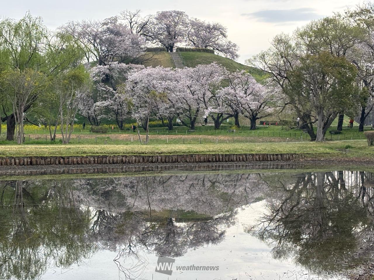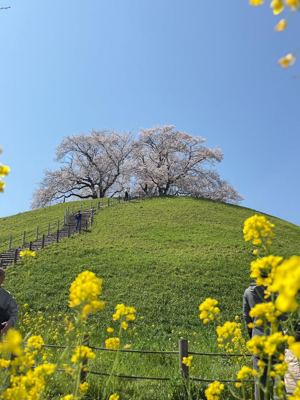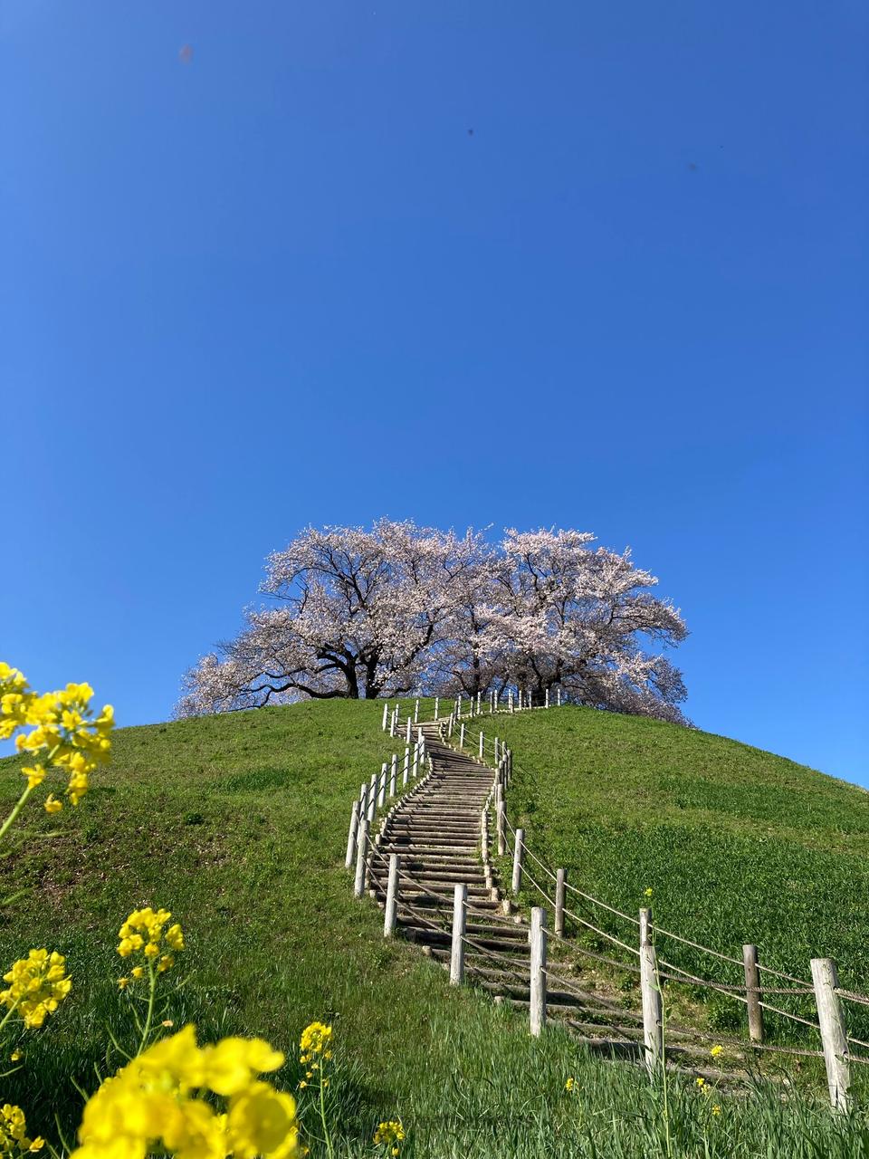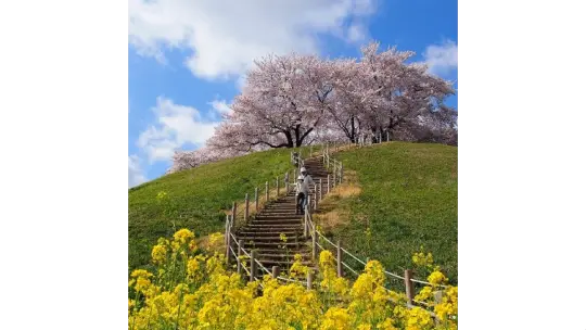 前方後円墳8基、円墳1基からなる大規模な古墳群さきたま古墳公園は国の史跡。直径105m、高さ18.9mと日本最大の円墳である丸墓山の頂上、斜面に桜の木が植えられ、古墳に桜と菜の花、そして青空と条件が揃えば古墳ならではのスケールが大きくSNS映えする風景写真を撮ることができます。また、古墳を囲む遊歩道、古墳にいたる石田堤にも桜並木が連なります。この「丸墓山古墳」は、映画『のぼうの城』の舞台で、石田三成による忍城「水攻め」の際には、この古墳の上に陣が張られたという歴史の舞台でもあります。