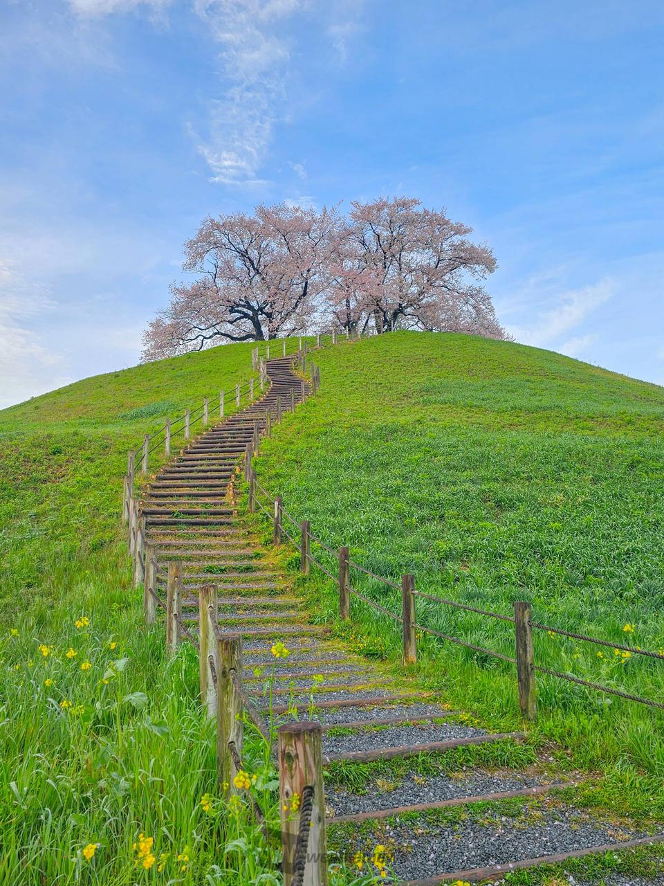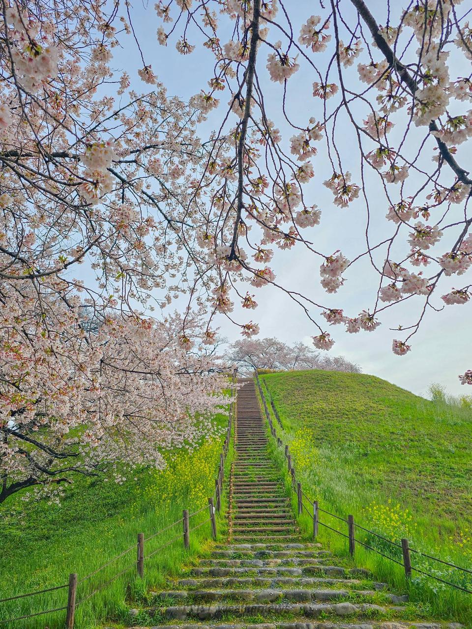 前方後円墳8基、円墳1基からなる大規模な古墳群さきたま古墳公園は国の史跡。直径105m、高さ18.9mと日本最大の円墳である丸墓山の頂上、斜面に桜の木が植えられ、古墳に桜と菜の花、そして青空と条件が揃えば古墳ならではのスケールが大きくSNS映えする風景写真を撮ることができます。また、古墳を囲む遊歩道、古墳にいたる石田堤にも桜並木が連なります。この「丸墓山古墳」は、映画『のぼうの城』の舞台で、石田三成による忍城「水攻め」の際には、この古墳の上に陣が張られたという歴史の舞台でもあります。