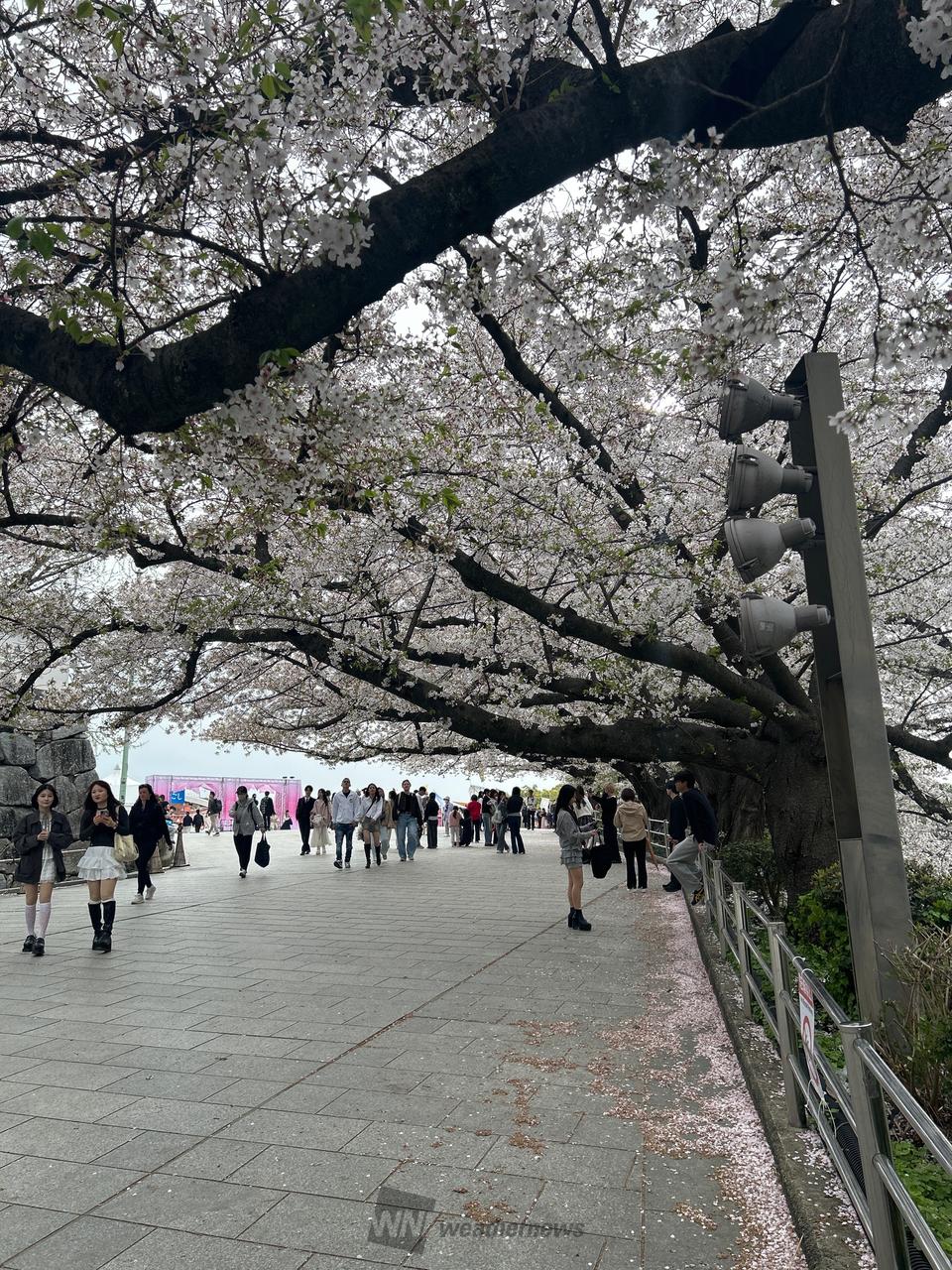 ソメイヨシノや八重桜など約1000本の桜が咲きます。一番の見所は、上之橋からの風景。桜がお濠の水面に映る姿は幻想的で写真に収めておきたいポイントです。
