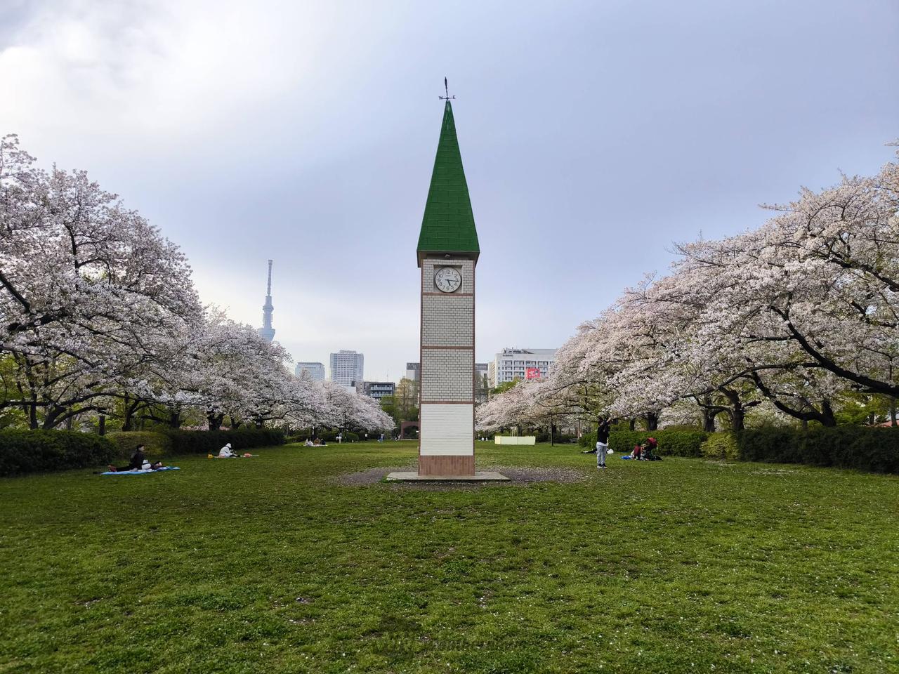 北園中央広場周辺は、時計塔、スカイツリーをバックに満開の桜とともに写真を撮ることができます。北園東側横十間川沿いは桜を見ながら散歩ができます。