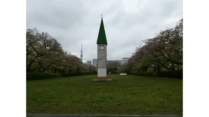 北園中央広場周辺は、時計塔、スカイツリーをバックに満開の桜とともに写真を撮ることができます。北園東側横十間川沿いは桜を見ながら散歩ができます。