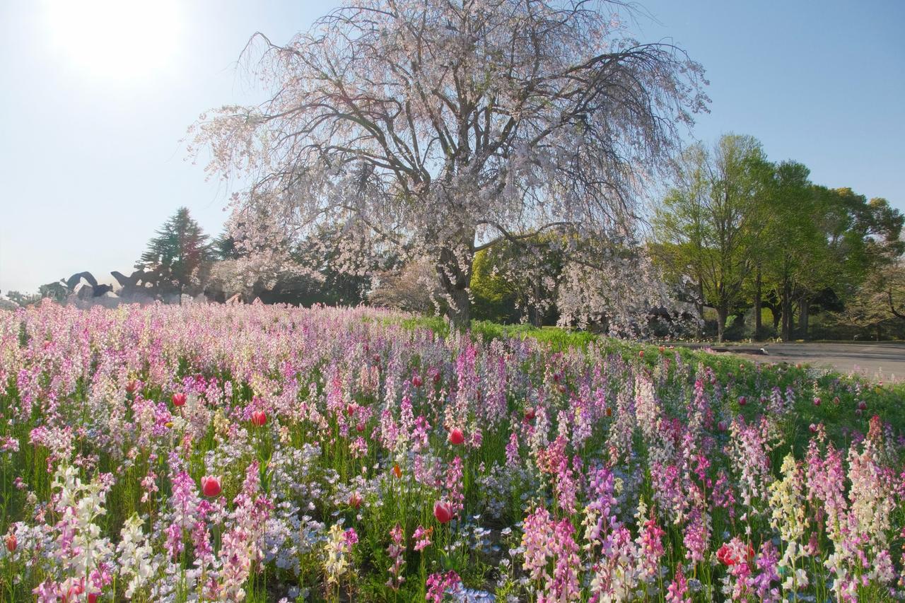 豊かな自然を有する国営昭和記念公園は、春になるとソメイヨシノをはじめ約1500本30品種の桜が咲き誇ります。渓流広場には絵画のように美しく植栽されたチューリップガーデン、花の丘ではネモフィラが登場します。東京ドーム約2倍の面積を持つ「みんなの原っぱ」や「こどもの森」には、ドーム型のトランポリンや日本一のハンモックなどの大型遊具のほか工作も楽しめます。一日たっぷり堪能できる公園です。サクラは八重桜を含め3月中旬〜4月中旬頃まで楽しむことができます。※開花情報は、公園公式ホームページをご確認ください。豊かな自然を有する国営昭和記念公園は、春になるとソメイヨシノをはじめ、約1500本30品種の桜をご覧いただけます。また、渓流広場には絵画のように美しく植栽されたチューリップガーデン、一番広い花畑の花の丘一面に広がる真っ赤なシャーレーポピー。そして東京ドーム約2倍の面積を持つみんなの原っぱにある花畑では、ネモフィラ、ハーブの丘にはブーケガーデンの花畑など、園内全体を春色に彩ります。子どもに人気のエリア「こどもの森」には、ドーム型のトランポリンや日本一のハンモックなどの大型遊具のほか、工作も楽しめ、一日たっぷり堪能できる公園です。※開花情報は、公園公式ホームページをご確認ください。