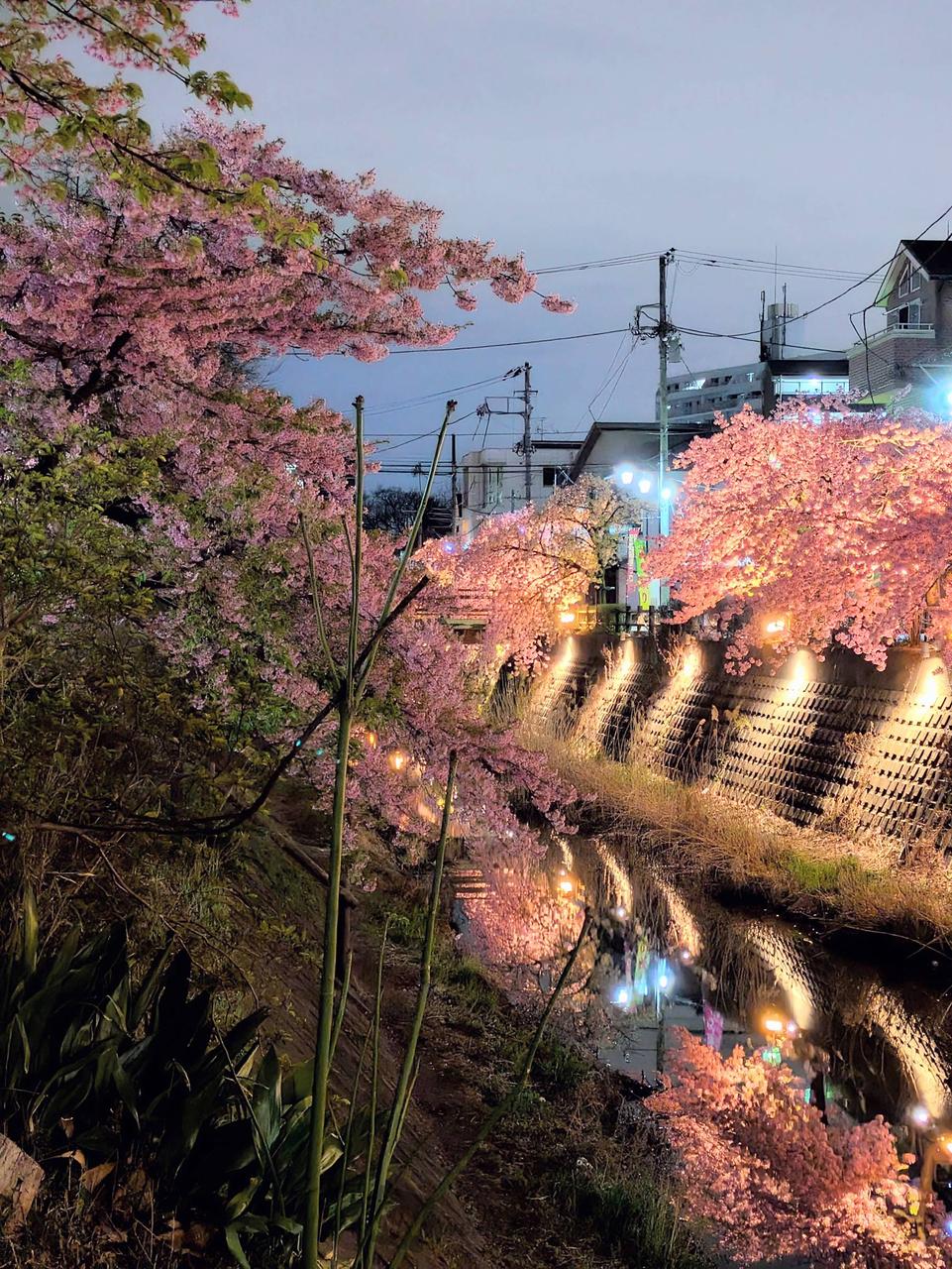 花と水辺の対比が絵になる風景です。近隣の寺社にはソメイヨシノもあり、カワヅサクラと続けて花が楽しめます。