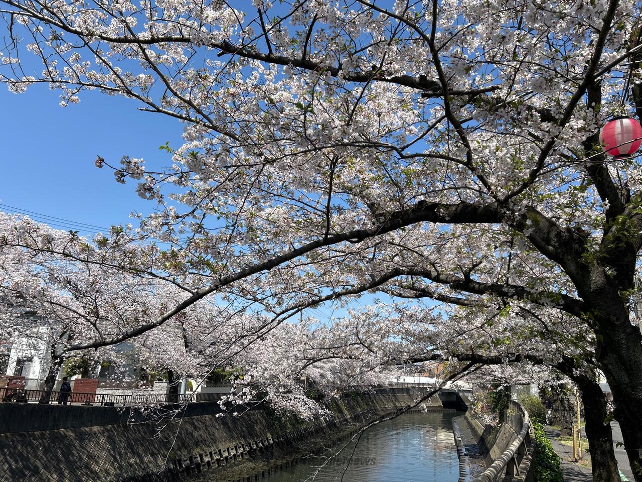 真間川の両岸沿い2kmにわたってソメイヨシノなど約400本の桜が植樹されており、水際までせり出す見事な枝ぶりと、川面に映る美しい姿で道行く人々を楽しませています。