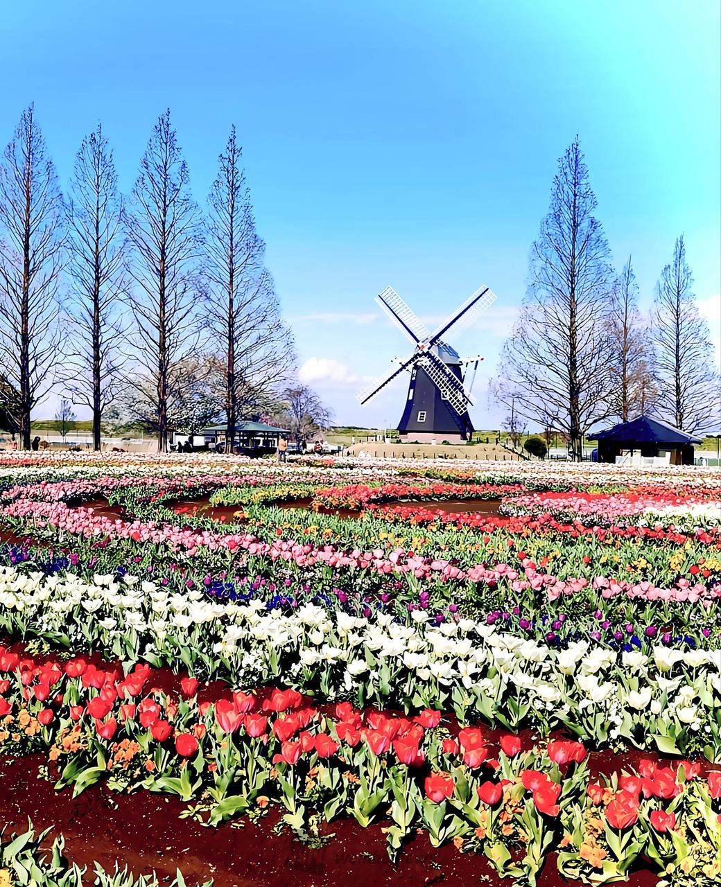 見頃時は露店も出店し、多くのお花見客でにぎわいます。隣接するあけぼの山農業公園の風車前花畑では、4月上旬ごろからチューリップが咲き始めます。※開花状況は天候等により大幅に前後する可能性あり