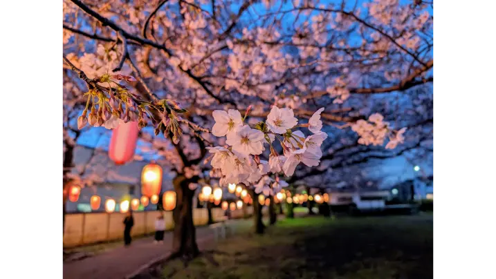 満開時には桜色の提灯が灯り、ノスタルジックで幻想的な夜桜が楽しめます。すぐ脇を電話が通るので、電車と夜桜のコラボも魅力的。
