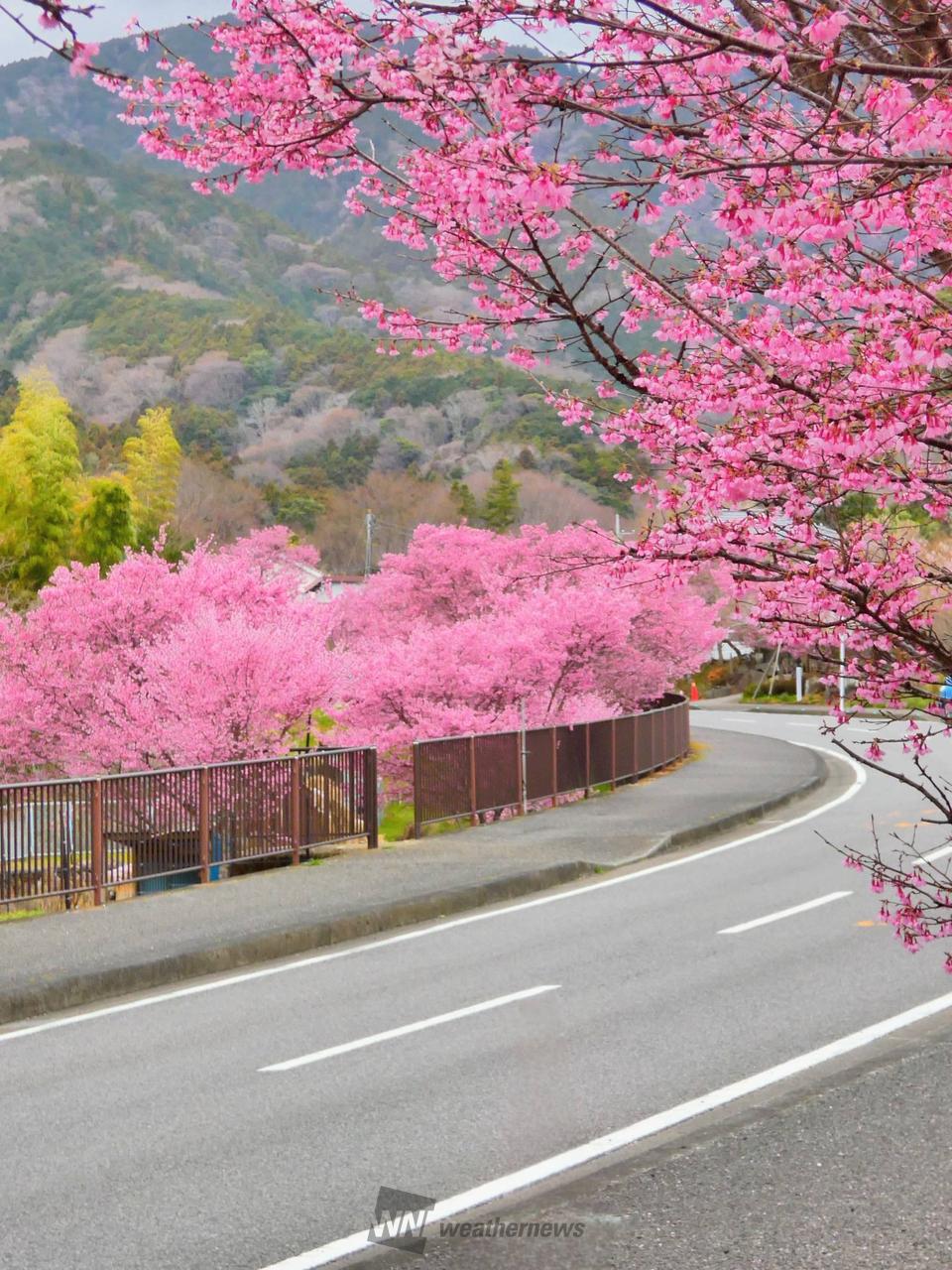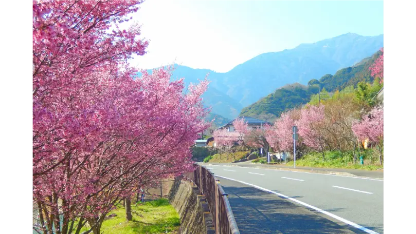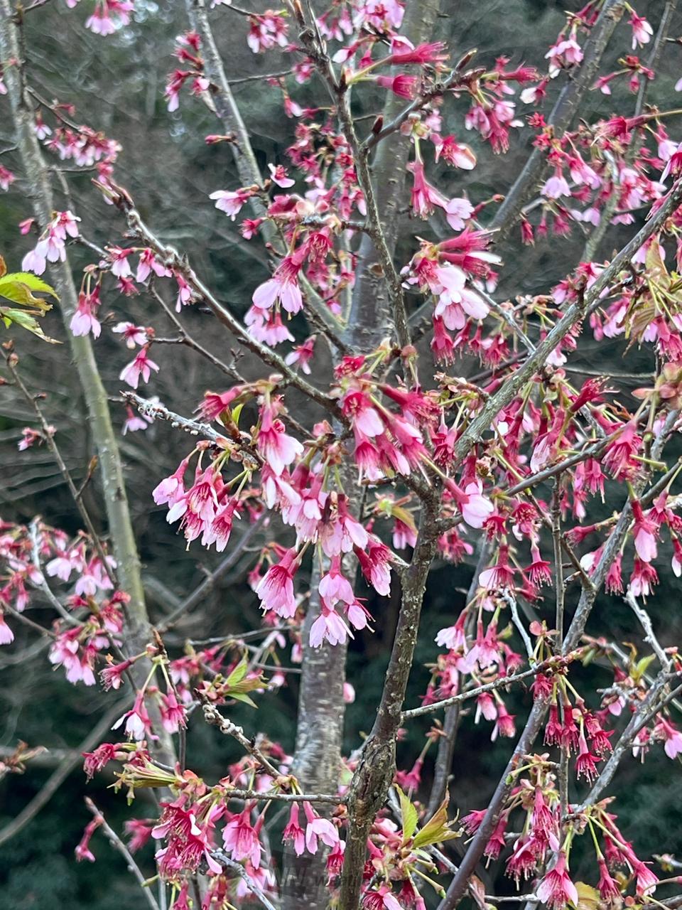 大山へ向かう新道沿いでは、春になるとおかめ桜がきれいに咲きます。
