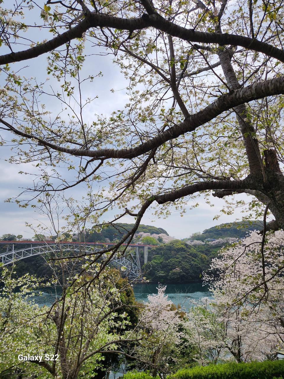 うす桃色の桜の開花と橋の下を流れるうず潮の見頃が重なり、美しいコントラストを描く。※火気の使用はできません。ソリゲレンデなど多数の遊具有り。