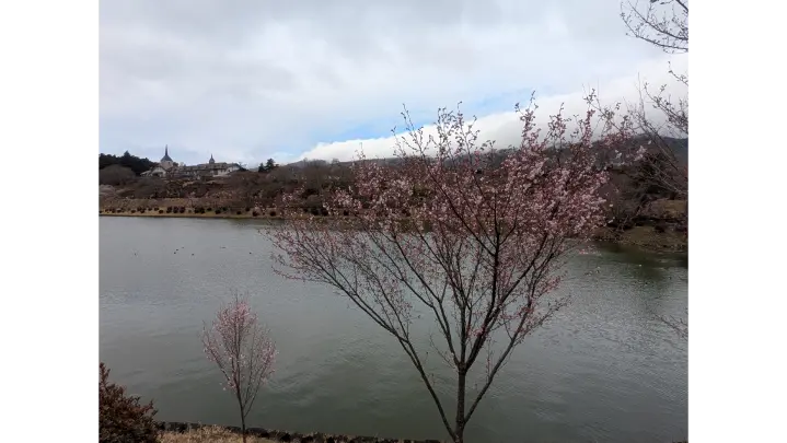 ため池100選のたつの海の周囲を約800本のヒガンザクラやソメイヨシノが咲き誇り、公園全体が美しい桜色に染まります。園内には遊歩道が整備されており、散策しながら桜と山々の絶景を楽しむことができます。
