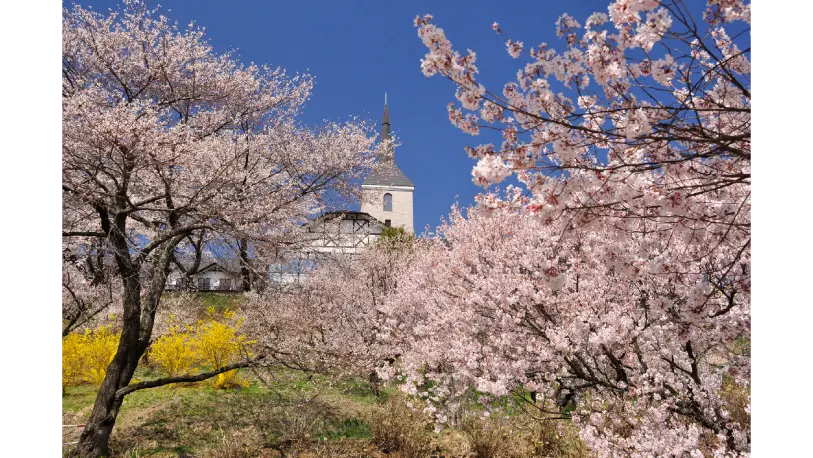 ため池100選のたつの海の周囲を約800本のヒガンザクラやソメイヨシノが咲き誇り、公園全体が美しい桜色に染まります。園内には遊歩道が整備されており、散策しながら桜と山々の絶景を楽しむことができます。