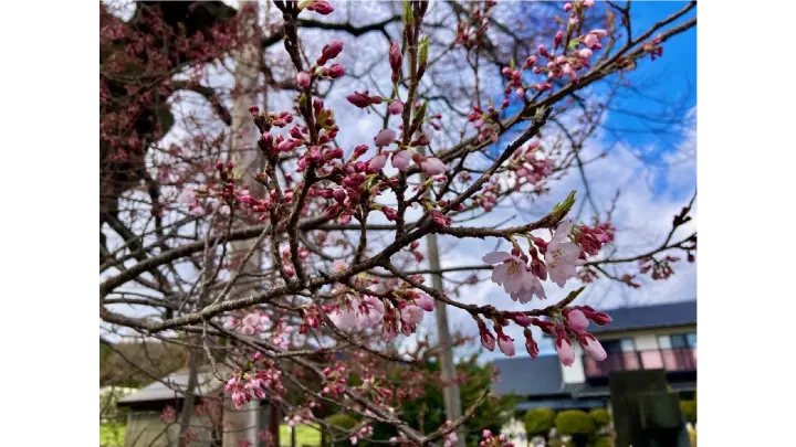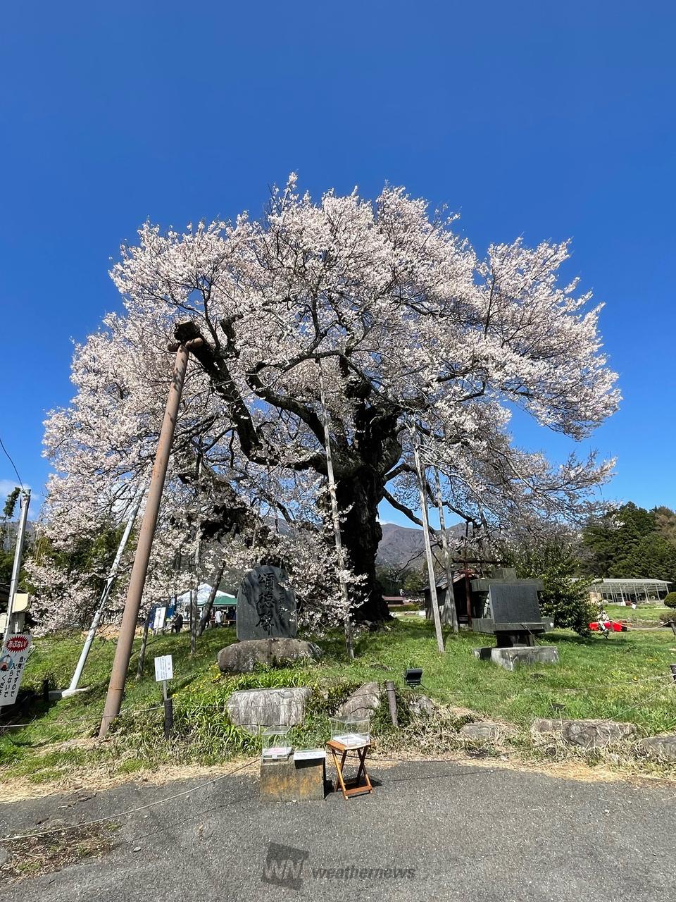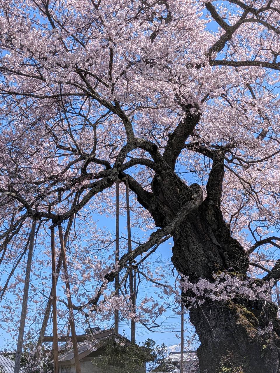 伊那地方を代表する桜の巨木、推定樹齢1000年と言われるエドヒガンザクラの巨木。根元には権現様が祀られ、権現桜と呼ばれ、古くから地元で親しまれています。(長野県指定天然記念物)樹勢が良く整い、やや小さめの花をいっぱいに咲かせます。東西の枝で、花の色味が若干違い、訪れる人を楽しませてくれます。