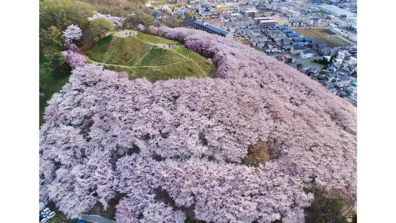 全長約66mの前方後方墳で3世紀末頃の墓と推定され、東日本最古級の前方後方墳。山全体にはソメイヨシノやヤマザクラなど約4000本が植樹される。山頂に登れば、桜と一緒に北アルプスや松本市街も一望できる。