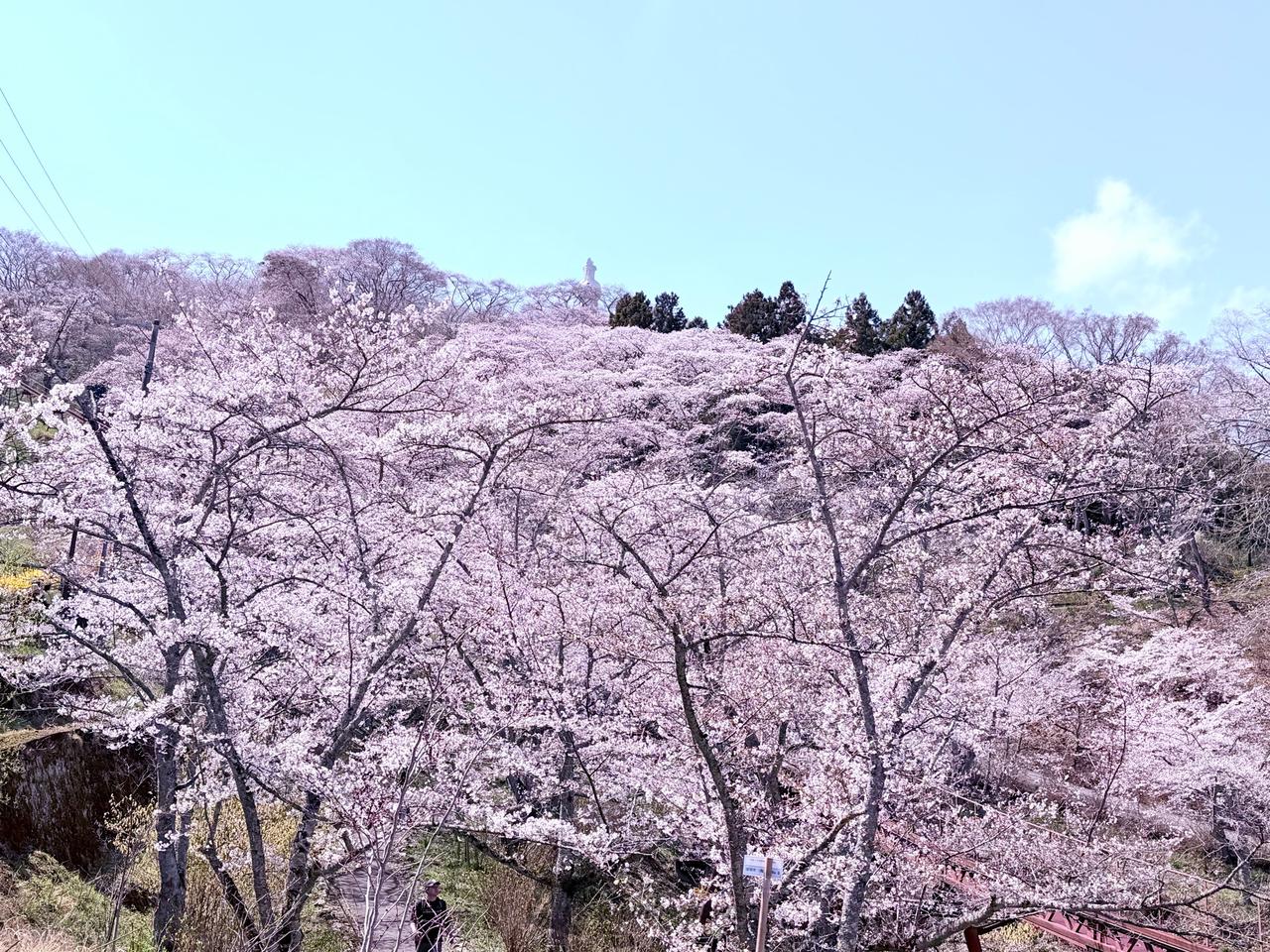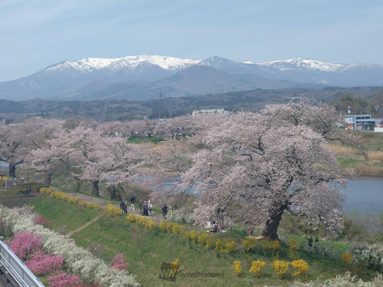 公園内には1300本以上の桜があり、白石川堤一目千本桜と共に宮城県内で唯一「さくら名所100選」の地に選ばれています。山頂まで登ると、船岡平和観音像の立つ山頂からは桜と白石川、雪を頂く蔵王連峰が一度に見渡せます。2017年に完成した白石川千桜公園には、桜のほかにも様々な花が植えられ、あらたな花見スポットとなっています。そのほかにも「樅ノ木は残った展望デッキ」や「しばた千桜橋」など、沢山の絶景スポットから桜をお楽しみいただけます。