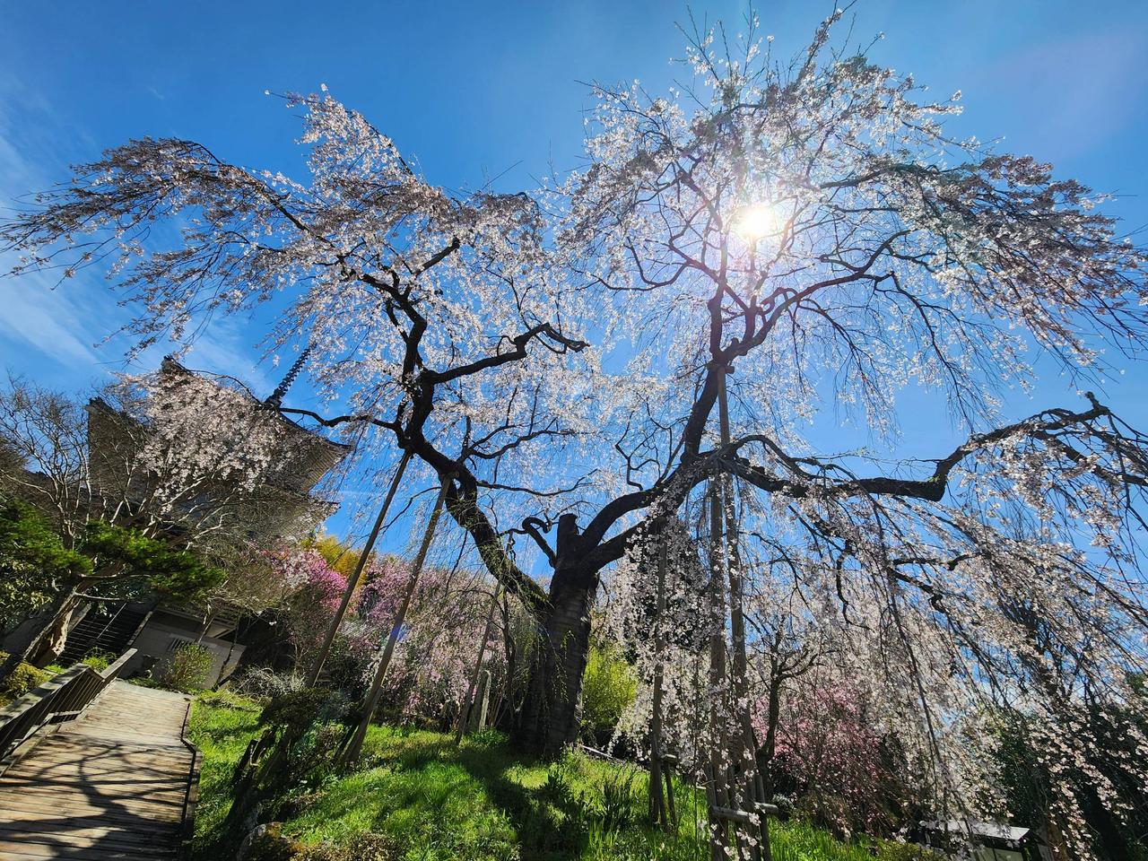 例年3月下旬〜4月初旬に県天然記念物の樹齢約300年のしだれ桜が美しく咲き誇ります。
