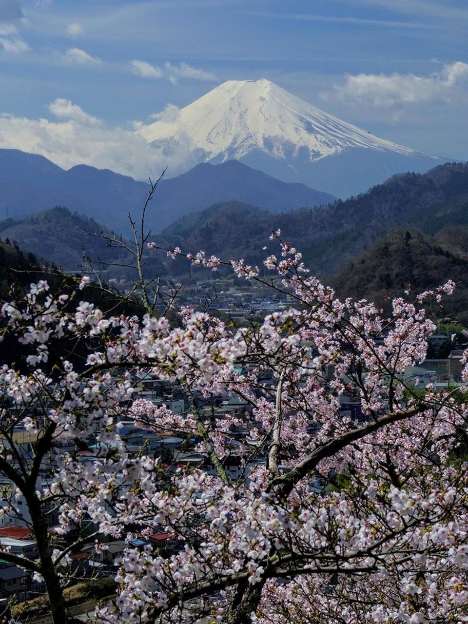 300本のソメイヨシノが咲き誇り、桜越しに富士山を望むことができる花見スポット