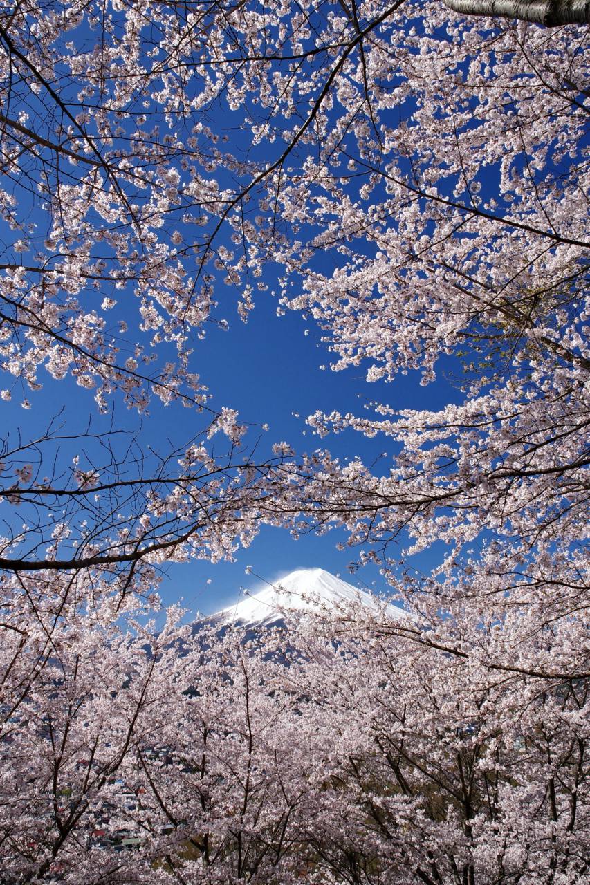 園内の五重塔(忠霊塔)と桜、そして富士山という日本的な美しい景色が広がります。