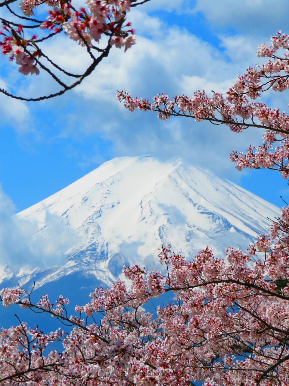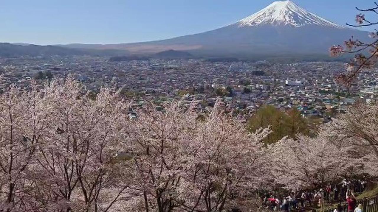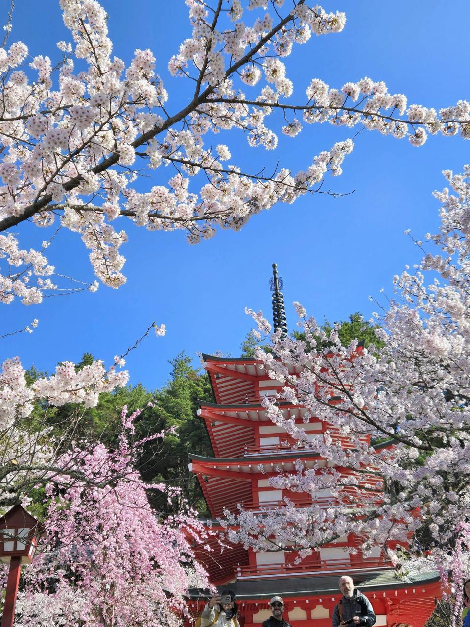 園内の五重塔(忠霊塔)と桜、そして富士山という日本的な美しい景色が広がります。