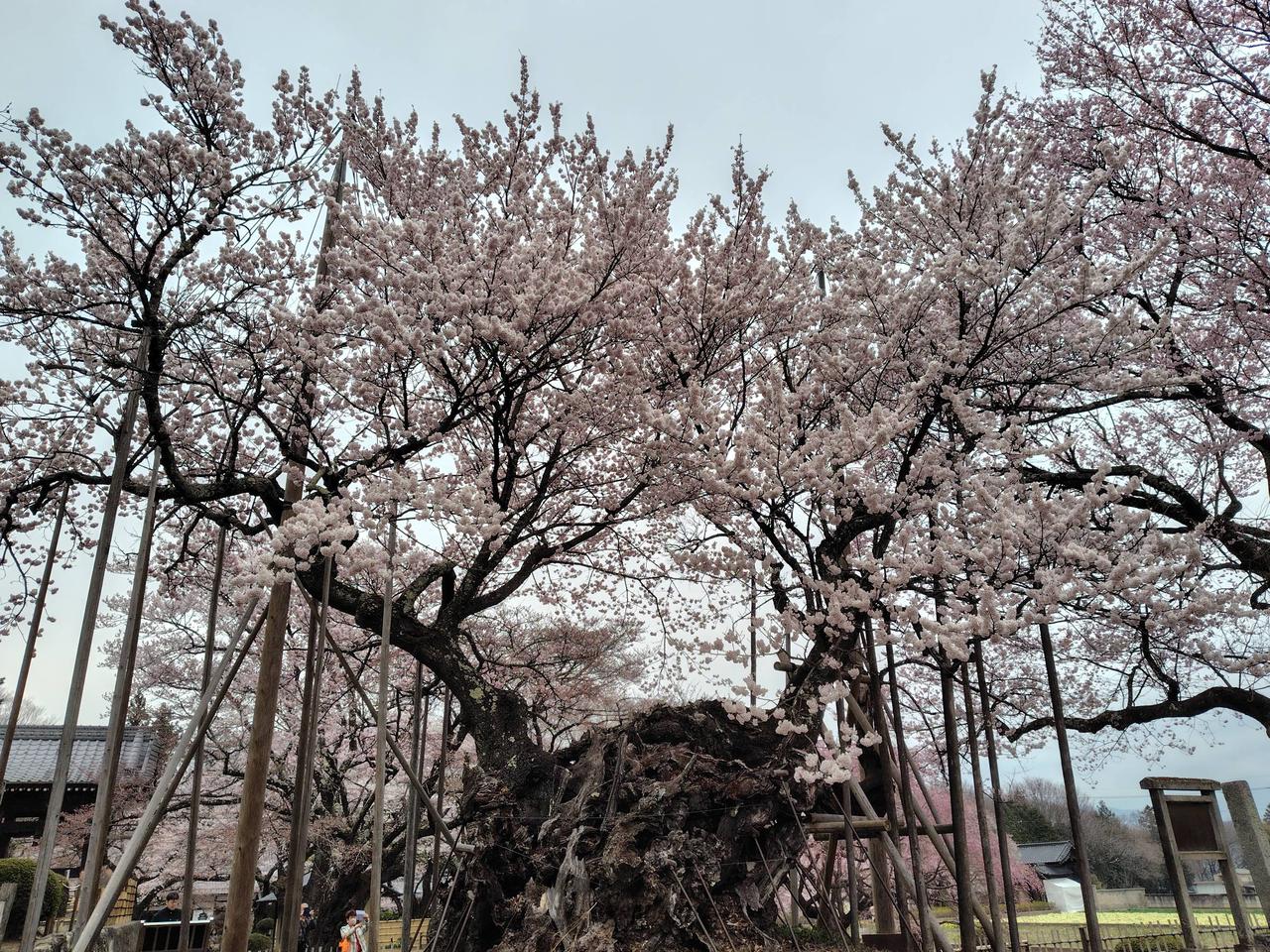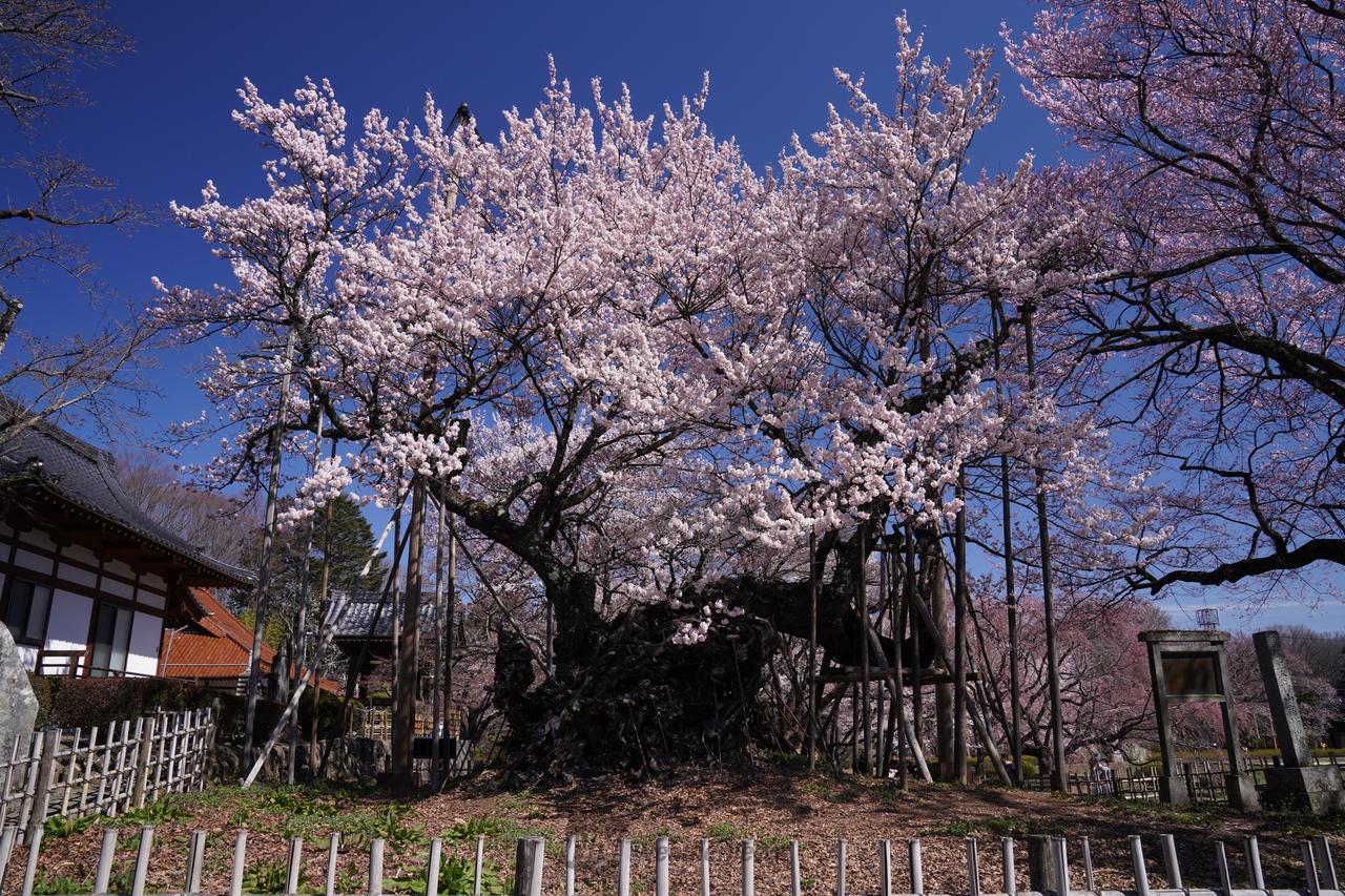 実相寺境内にそびえる山高神代桜は、日本三大桜の一つで樹齢約2000年、国指定天然記念物で日本最古の桜といわれています。日本武尊が植えたという言い伝えがあり、悠久の時を感じる古木です。桜の開花にあわせて約8万本のラッパ水仙が咲き誇ります。