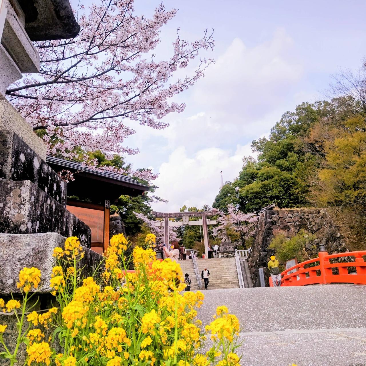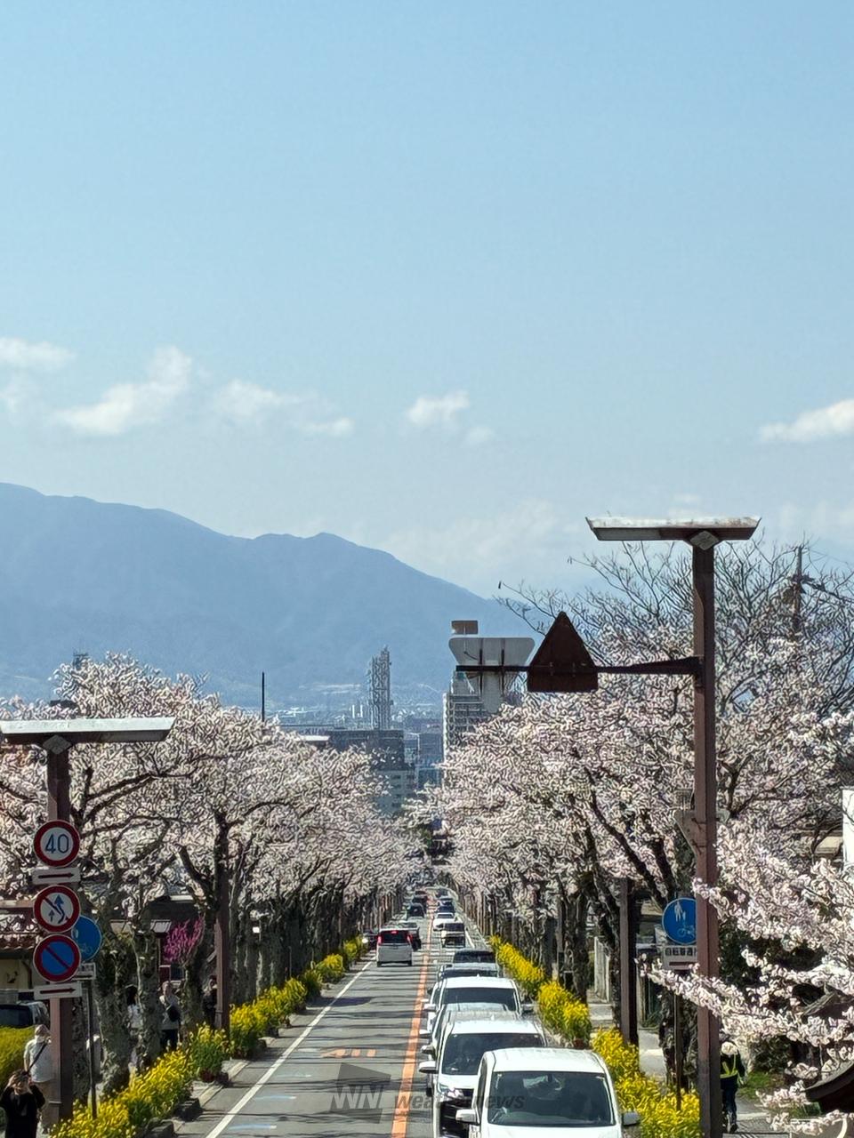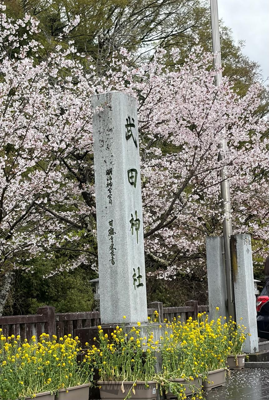 神社境内及び境内周辺(約50本)は、御祭神武田信玄公在世中の居館「躑躅ヶ崎館(つつじがさきやかた)」跡の情景に彩りを添えており、さらにJR甲府駅から武田神社までの、南北約2kmに渡る一本道、通称「武田通り」の桜並木(約300本)は、圧巻で、見応えがあります。