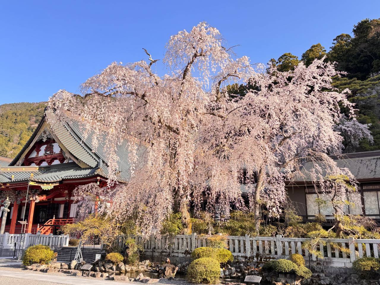 鎌倉時代に日蓮聖人によって開かれたお寺で日蓮宗の総本山。境内には「全国しだれ桜10選」にも選ばれた樹齢400年の古木をはじめ多数のしだれ桜が楽しめます。