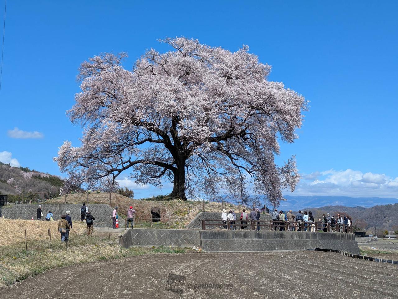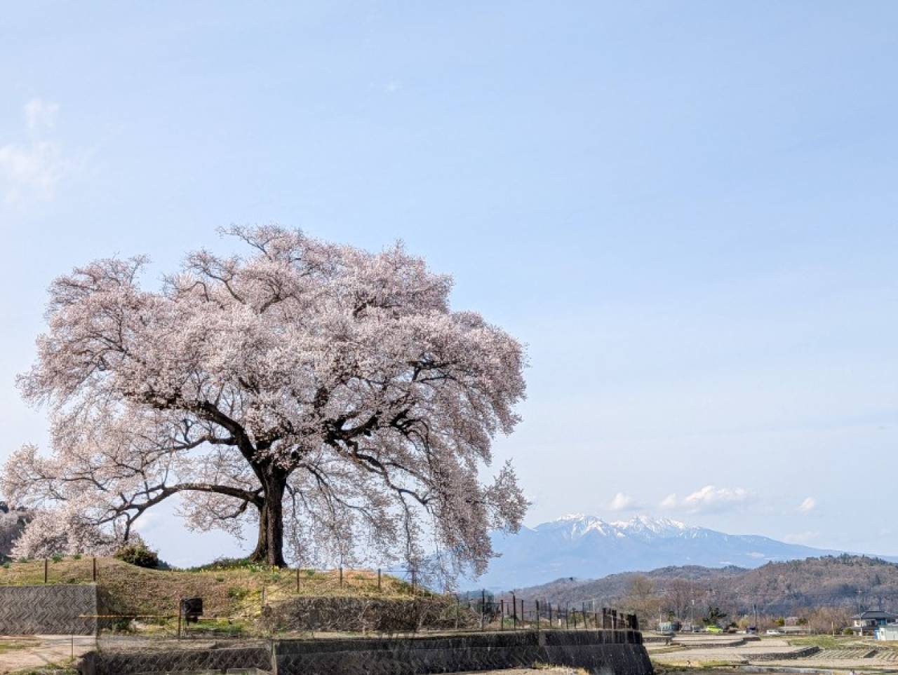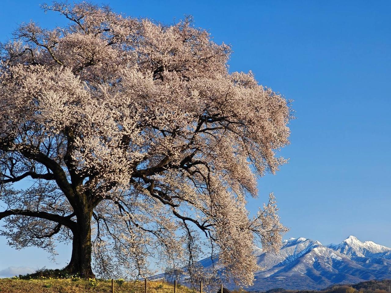 樹齢300年を越えるエドヒガンザクラ。塚の上に立つ一本桜で、平成元年に韮崎市の天然記念物に指定されました。「わに塚」の名の由来は、日本武尊の王子・武田王のお墓という説や、塚の形が鰐口(仏具の一種)に似ていることからなど諸説あります。残雪の富士山や八ヶ岳を背景に咲き誇る姿は、凛とした美しさで訪れる人々を魅了し、フォトジェニックな名所として人気です。見ごろの時期にはライトアップも行われ、昼間とは一味違った幻想的な姿を楽しむことができます。