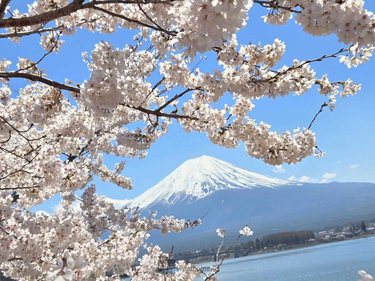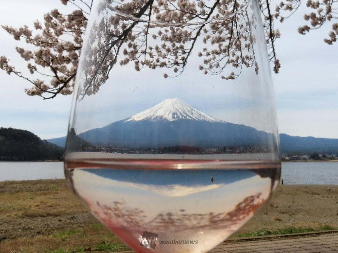 湖越しの富士山と河口湖北岸の桜並木のコラボレーション
