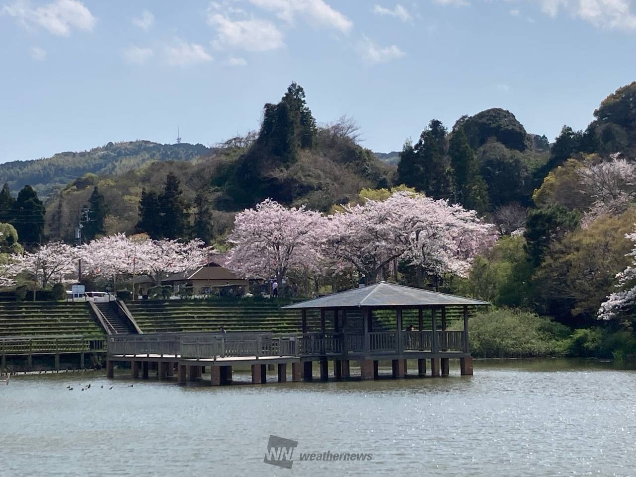 池の周囲から見はらし台にかけてソメイヨシノなどが咲いている。3月下旬~4月成就までライトアップを実施している。