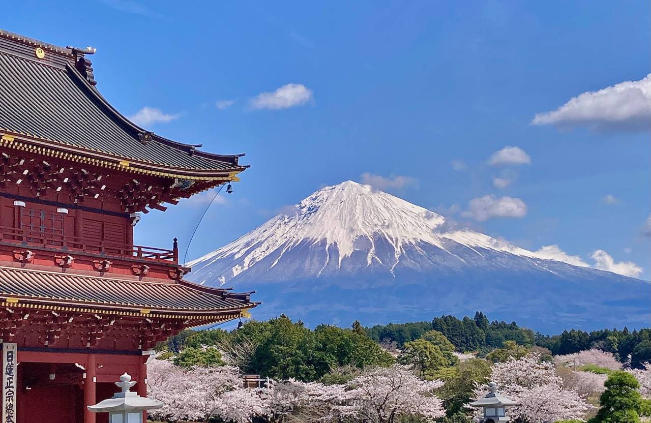 大石寺に向かう車中、花盛りの時期には大石寺一体が桜の花で覆われたように見えます。花期は例年3月下旬~4月上旬。毎年4月6日・7日は一般の花見客は進入禁止になり、また毎週土日も進入禁止になります。