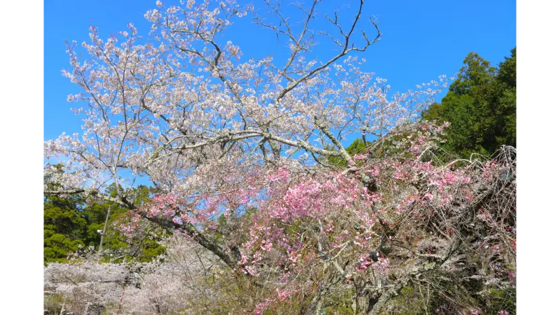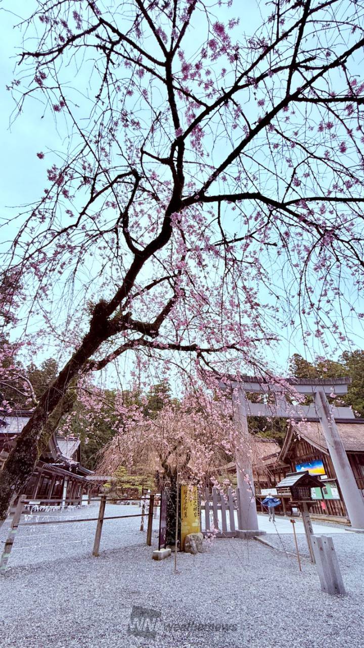 「癒しの斎庭」(いやしのゆにわ)と呼ばれる境内には春の訪れを告げる様々な桜が咲き揃います。大願成就の縁起石『家康公の立ち上がり石』のすぐそばにある薄桃色の花を付ける枝垂桜は県内のフォトスポットとして親しまれ、桜木の下、石に腰かけながら写真撮影を楽しむことができます。また、門前にひと際目を引く江戸彼岸の枝垂桜や桜などが境内各所に咲き、心を和ませてくれます。「御衣黄」や「菊桜」などの珍しい種類の桜も開花し、華やかなご神域に多くの参拝者が訪れます。令和6年には台湾から海を渡り、日台友好の証として昭和天皇ゆかりの寒緋桜も植樹されました。