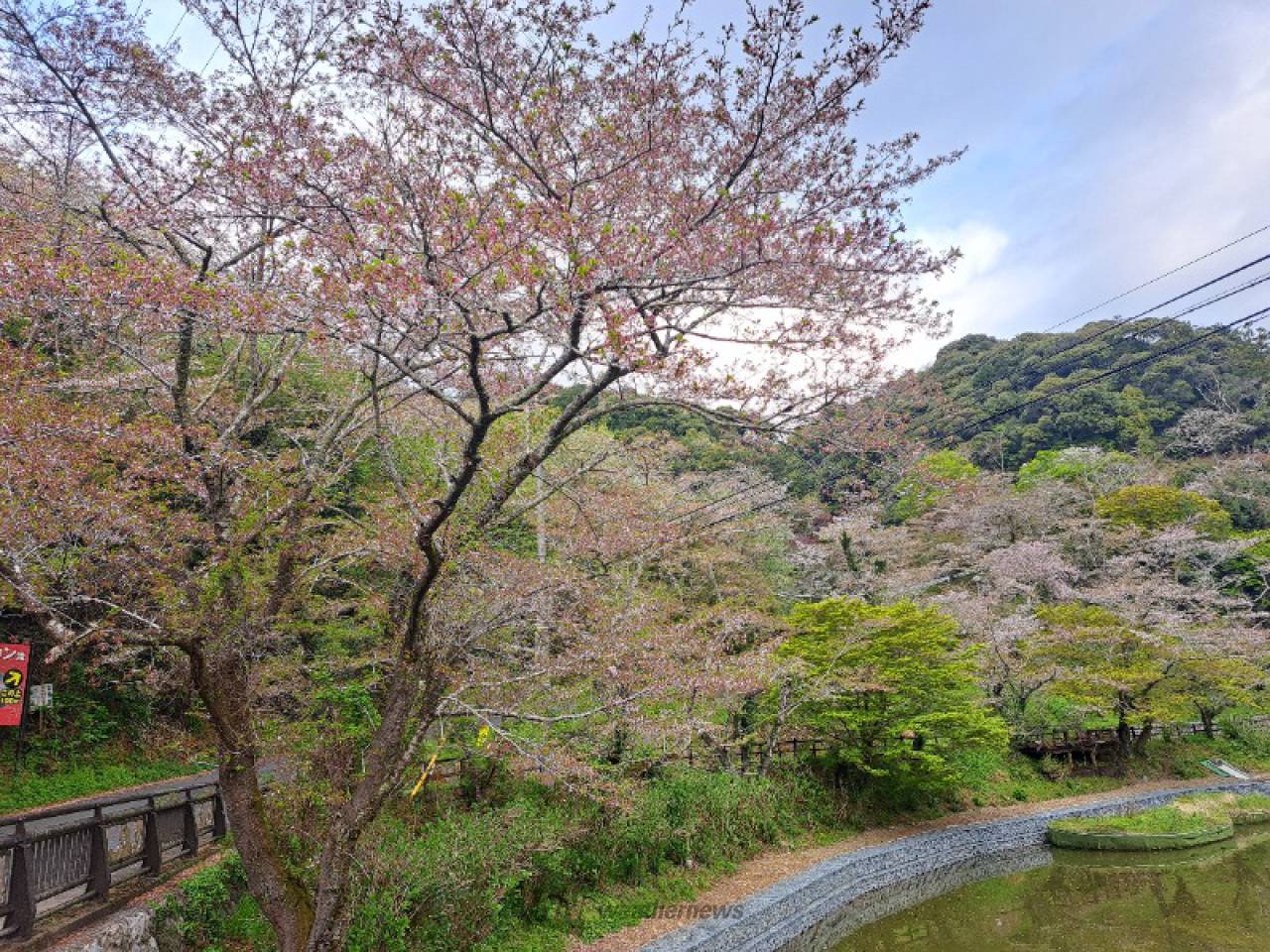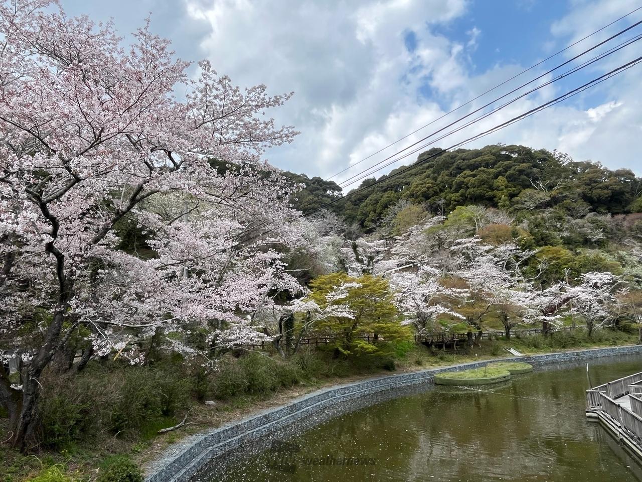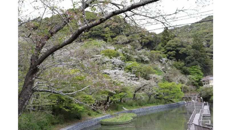 静かな山あいの公園です。公園とその周辺で約1000本の桜が咲き誇ります。公園内の池に浮かぶ浮き桟橋「夢の浮き橋」から見る桜は絶景です。