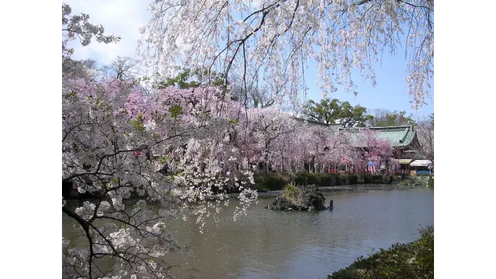 2月下旬の河津桜から4月上旬の八重桜まで、約15種200本の桜が本殿へと続く参道、神池沿いで開花。3月下旬~4月上旬にかけてライトアップを実施。