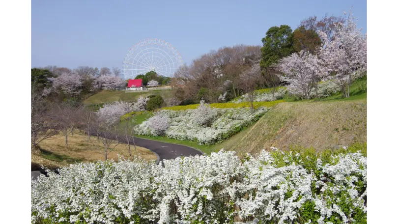 広大な公園内いたるところに桜が植えられており、ソメイヨシノをはじめ、早咲きのカワヅザクラから遅咲きのウコンザクラまで長い期間サクラを楽しむことができる。