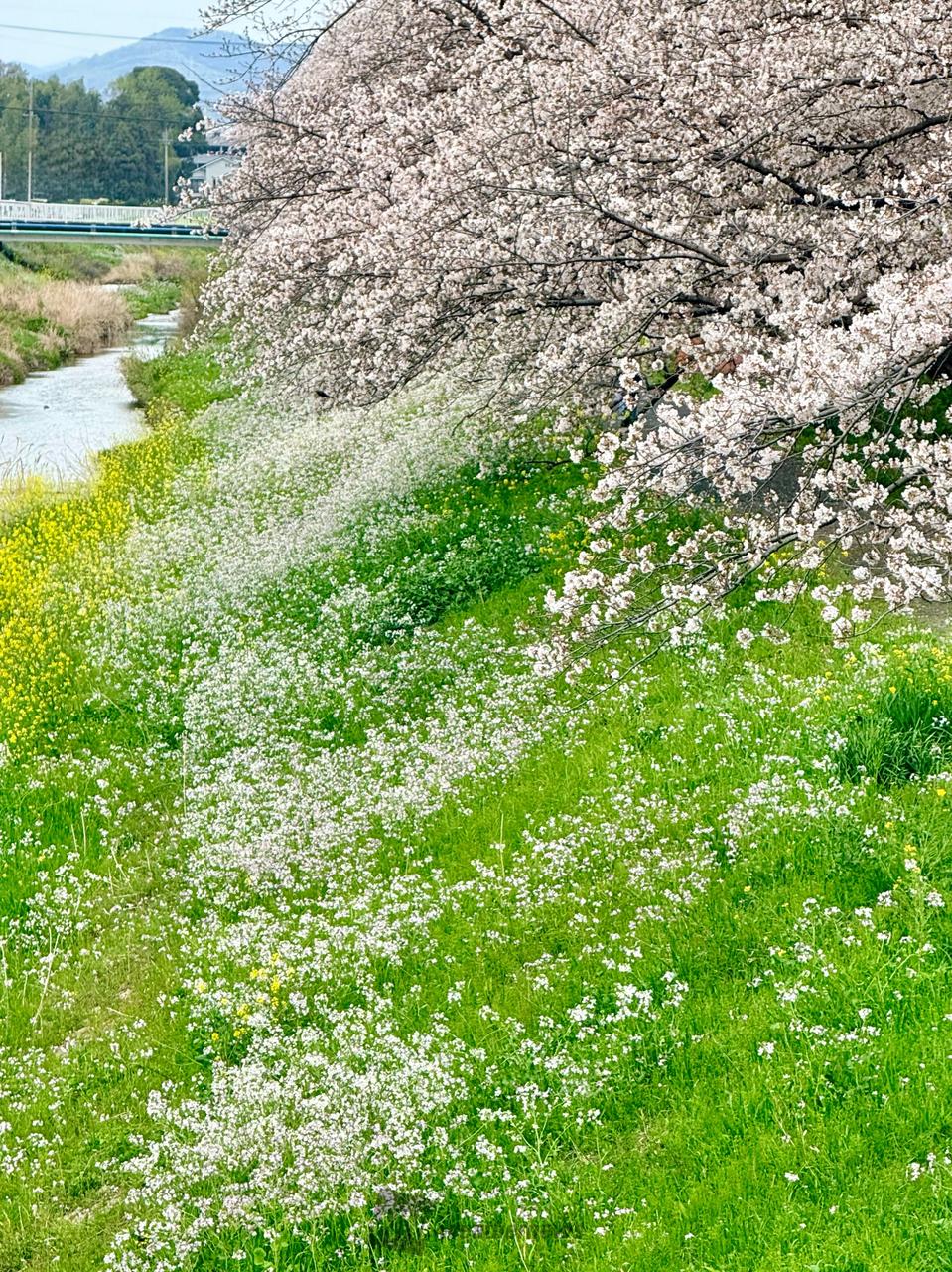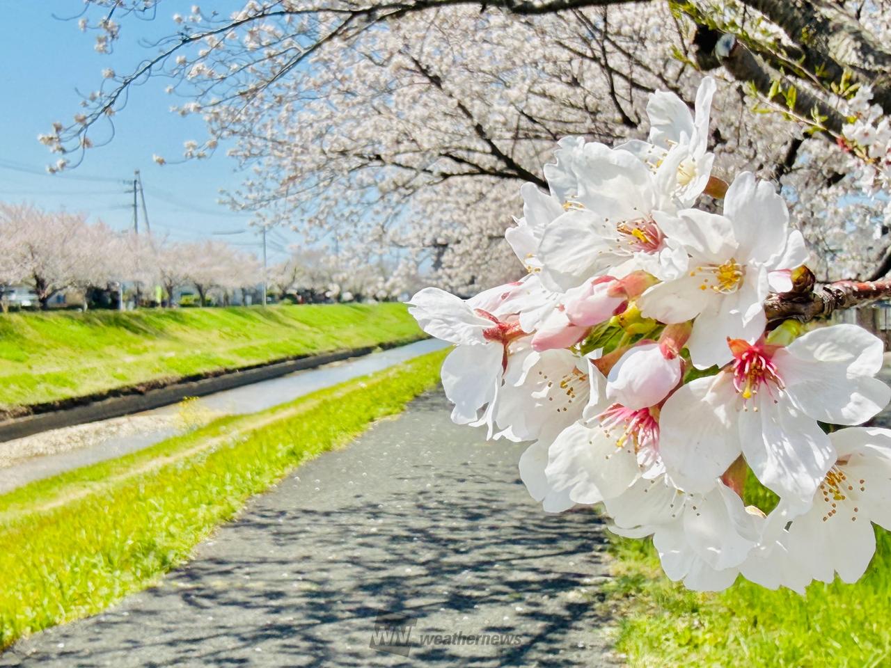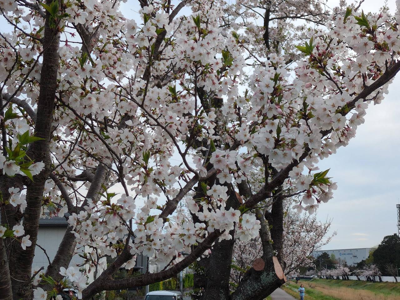 両岸約4kmにわたって約650本の桜並木が続いています。堤防沿いは散策やウォーキングを楽しむ人の姿が多く見られ、市民の憩いの場となっています。サクラの満開となる頃には川岸に菜の花も咲き誇り、ピンクと黄色の花のコントラストは実に見事です。