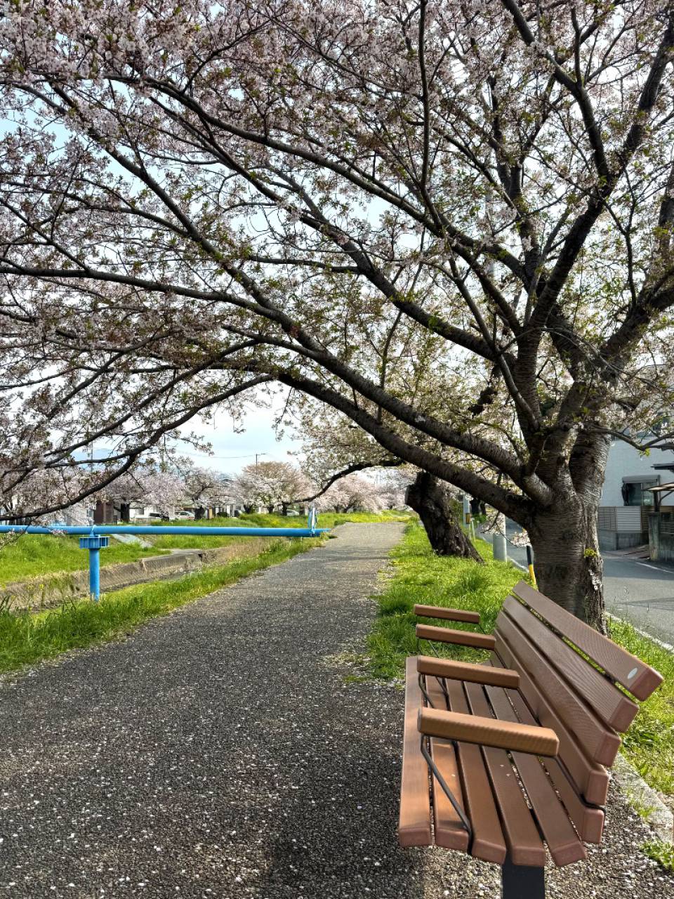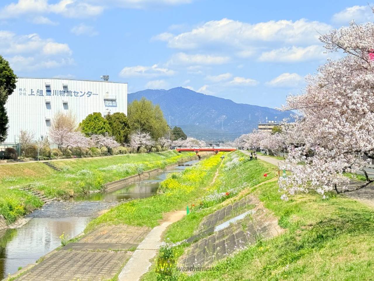 両岸約4kmにわたって約650本の桜並木が続いています。堤防沿いは散策やウォーキングを楽しむ人の姿が多く見られ、市民の憩いの場となっています。サクラの満開となる頃には川岸に菜の花も咲き誇り、ピンクと黄色の花のコントラストは実に見事です。