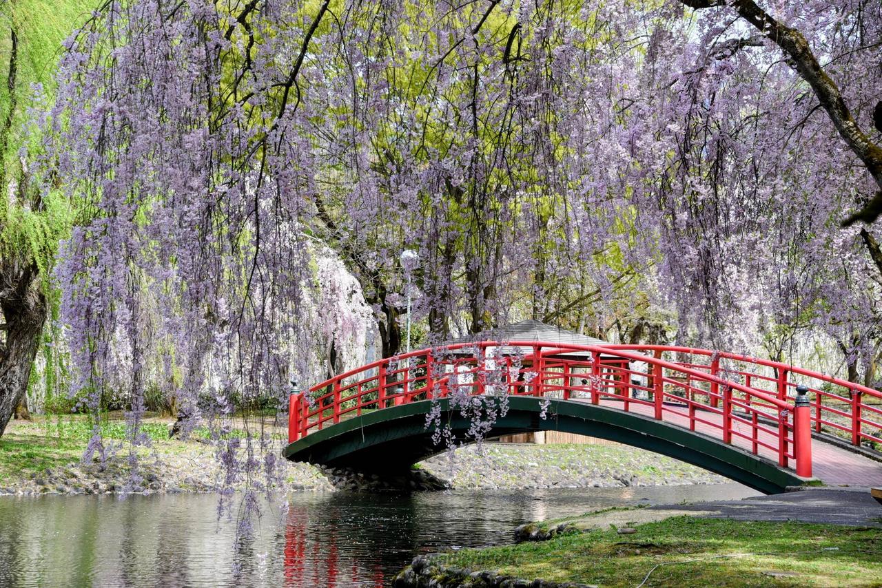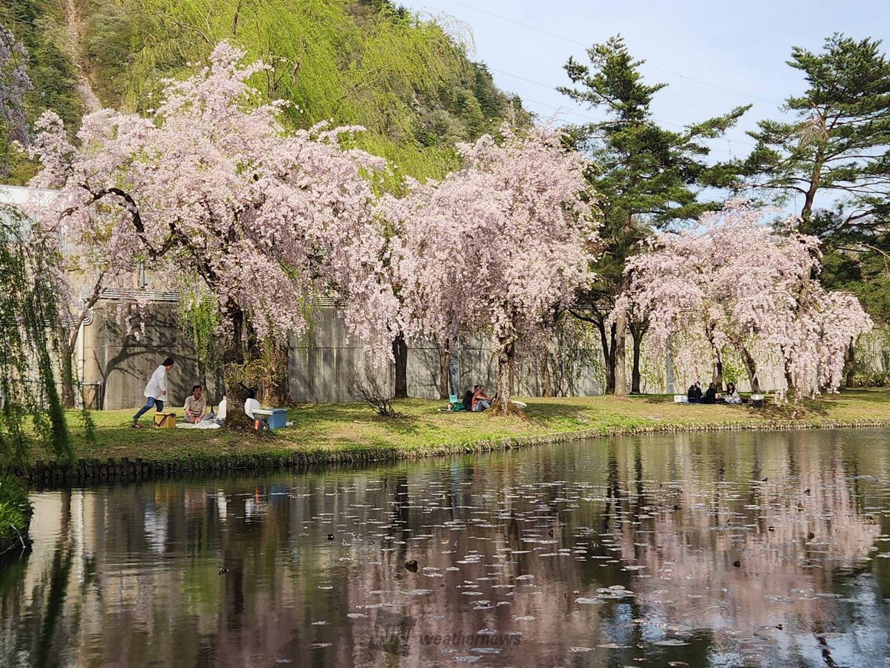 桜は公園内にある池の周りに配植されていて、桜のピンク色と遠くの山々の残雪とのコントラストが綺麗な時期。春の遅い湯沢では、例年、4月中旬から5月上旬にかけて桜が見ごろとなります。