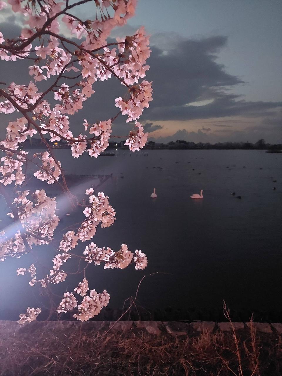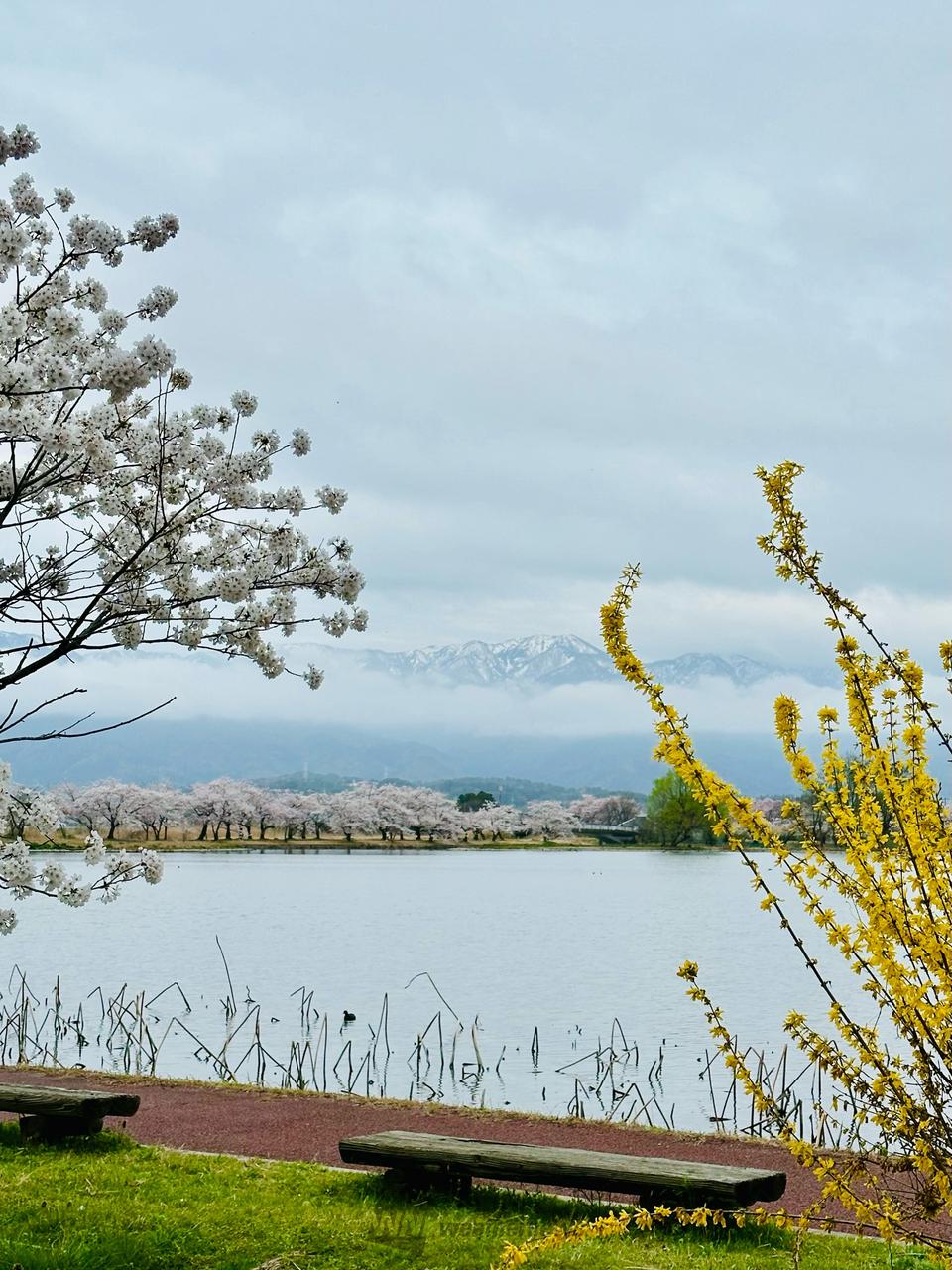 ハクチョウたちの北帰行が終わった4月上旬から湖岸を廻るように植えられた桜並木(主にソメイヨシノ)の花がほころび始め、例年4月上旬に見頃を迎えます。瓢湖(本池)は1周約1.2kmで、桜並木の下を散策できます。また、ゴールデンウィークの頃には、小高い八重桜園に植えられたヤエザクラが見頃となります。