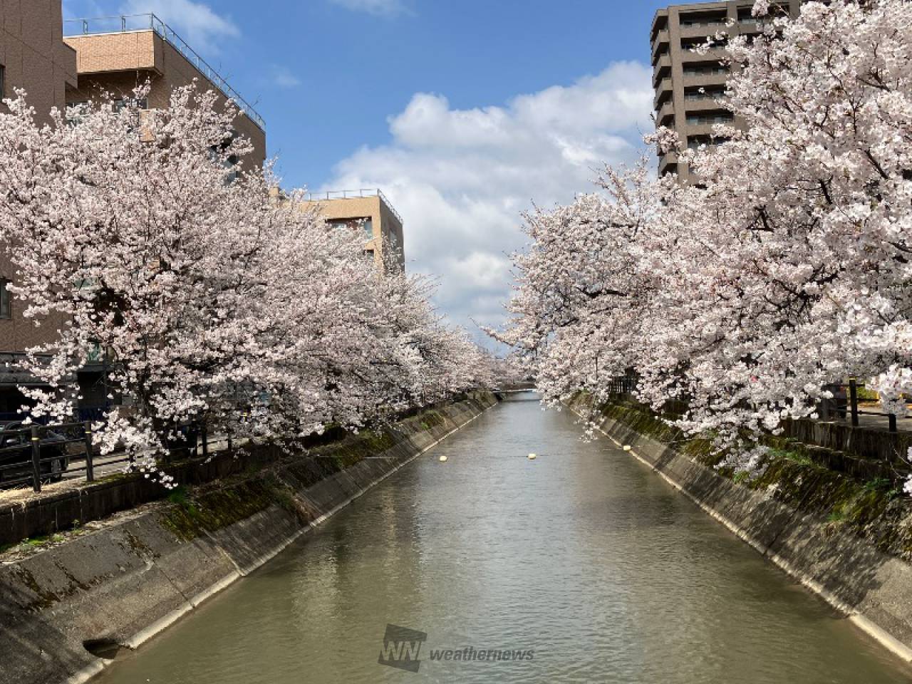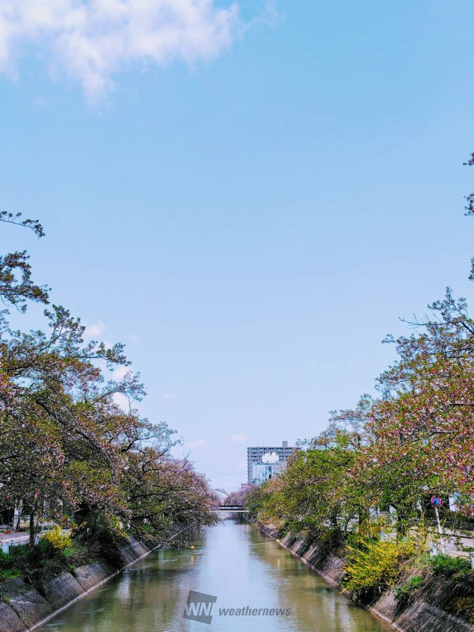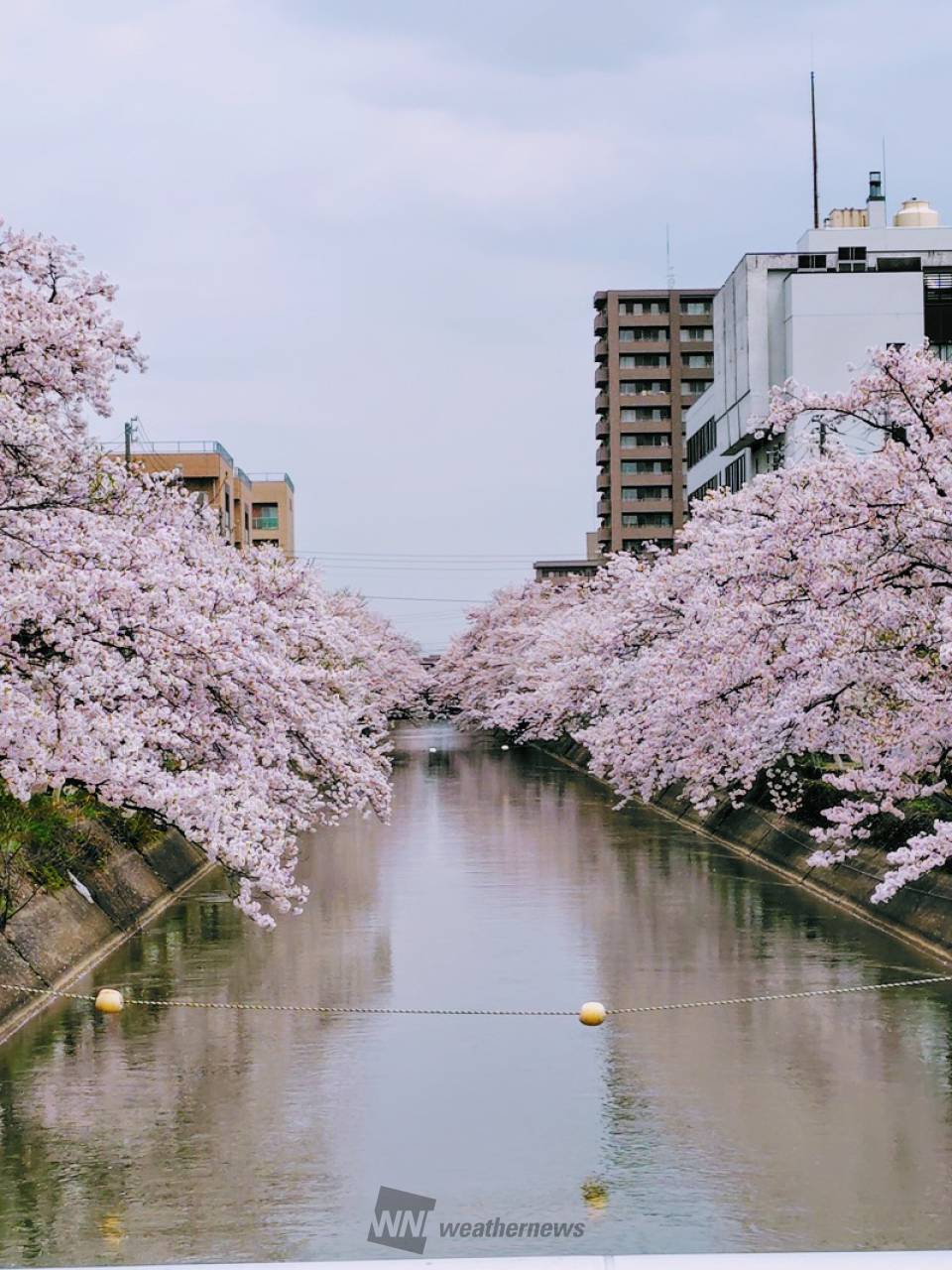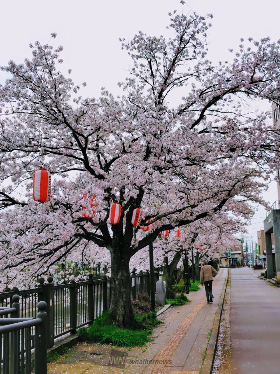 長岡駅近くを流れる用水路沿い約1㎞にわたって、川面に覆いかぶさるように立派な桜が連なります。